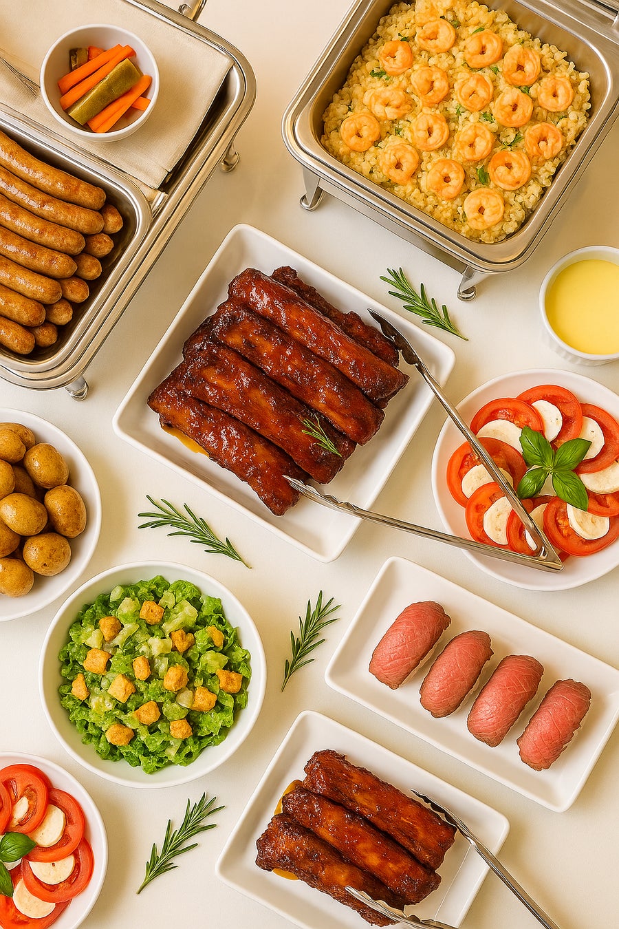 ビュッフェには、ローストビーフ寿司や海老ピラフ、スペアリブなど、シェフが腕をふるう料理が18品以上並びます。岡山ならではの桃太郎トマトや瀬戸内食材を使った前菜も登場。