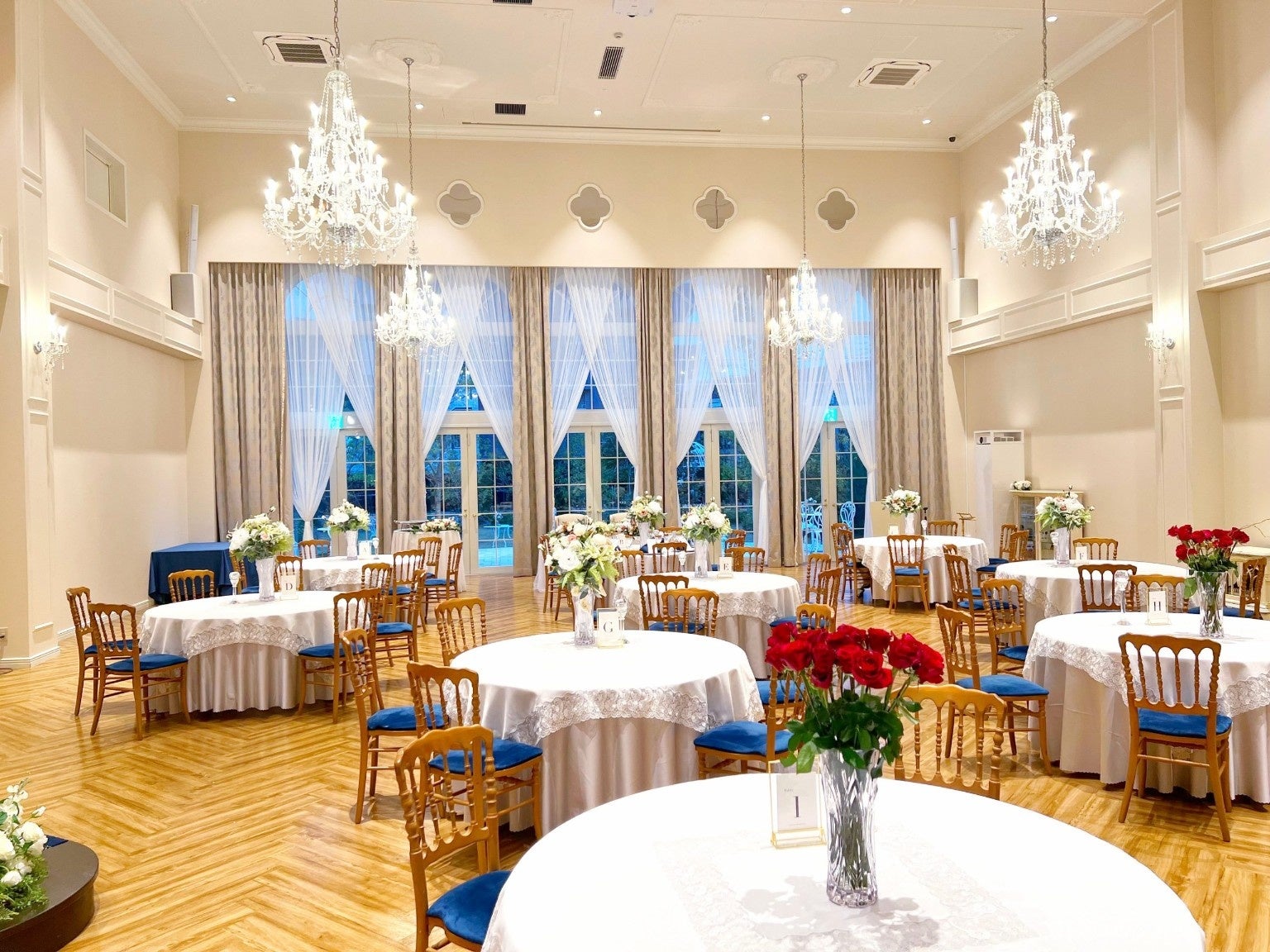 天井高7メートルのエレガントな披露宴ホールの外には、英国チェルシーフラワーショーで8年連続金賞を受賞した庭園デザイナーによる和庭園「錦庭」とローズガーデンが広がります。