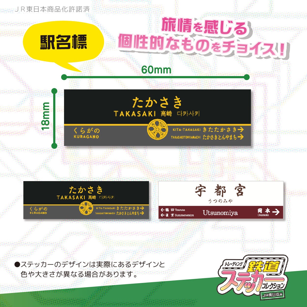 内容:駅名標/乗車位置案内/駅ナンバリング/車両ロゴマーク等をモチーフにしたトレーディングステッカー