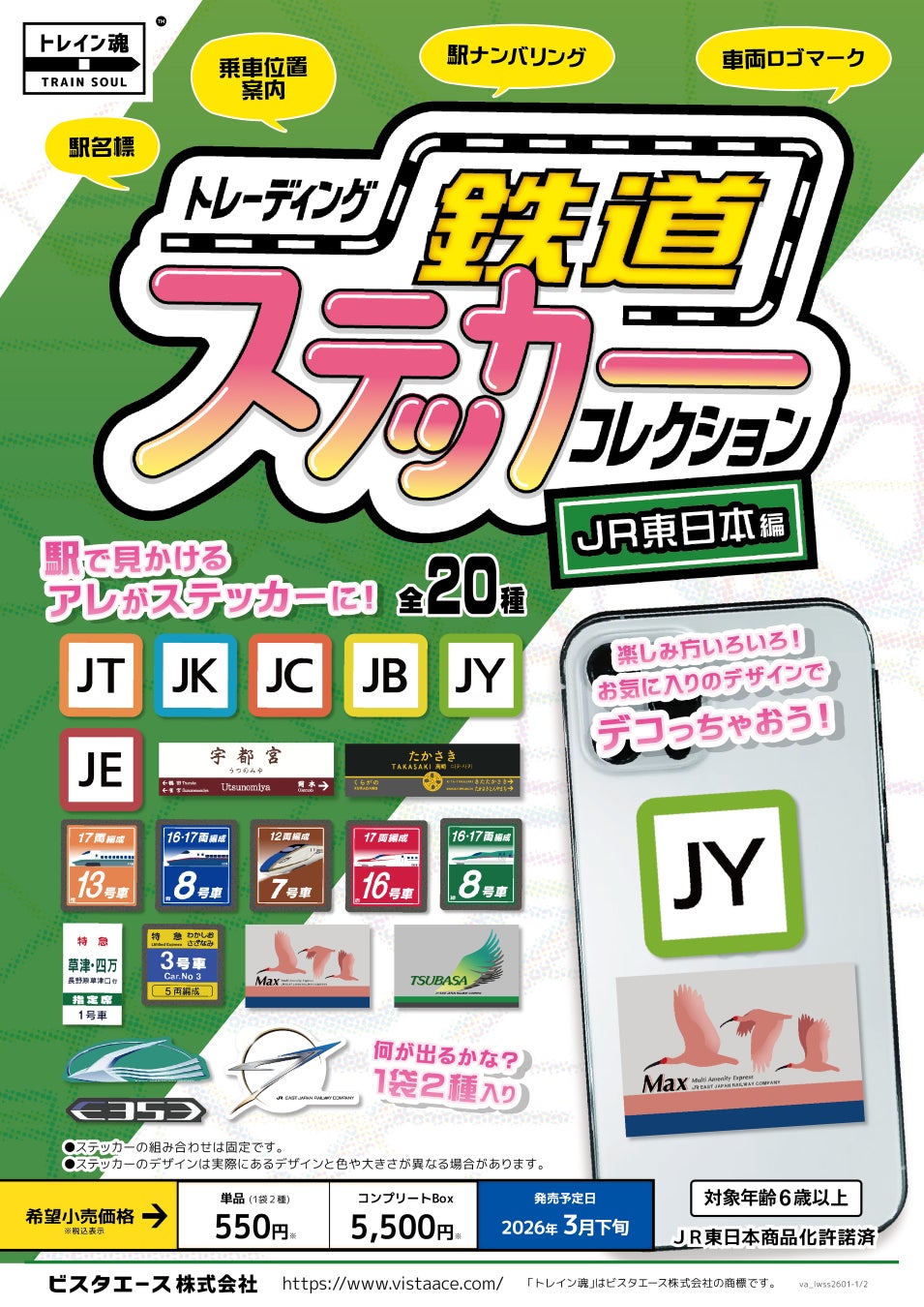 ビスタエース株式会社(東京都新宿区)は、鉄道グッズブランド「トレイン魂」シリーズ第二弾として、駅のホームや車両などで見かけるサイン類をモチーフにした『トレーディング 鉄道ステッカーコレクション JR東日本編』を2026年春に発売予定です。