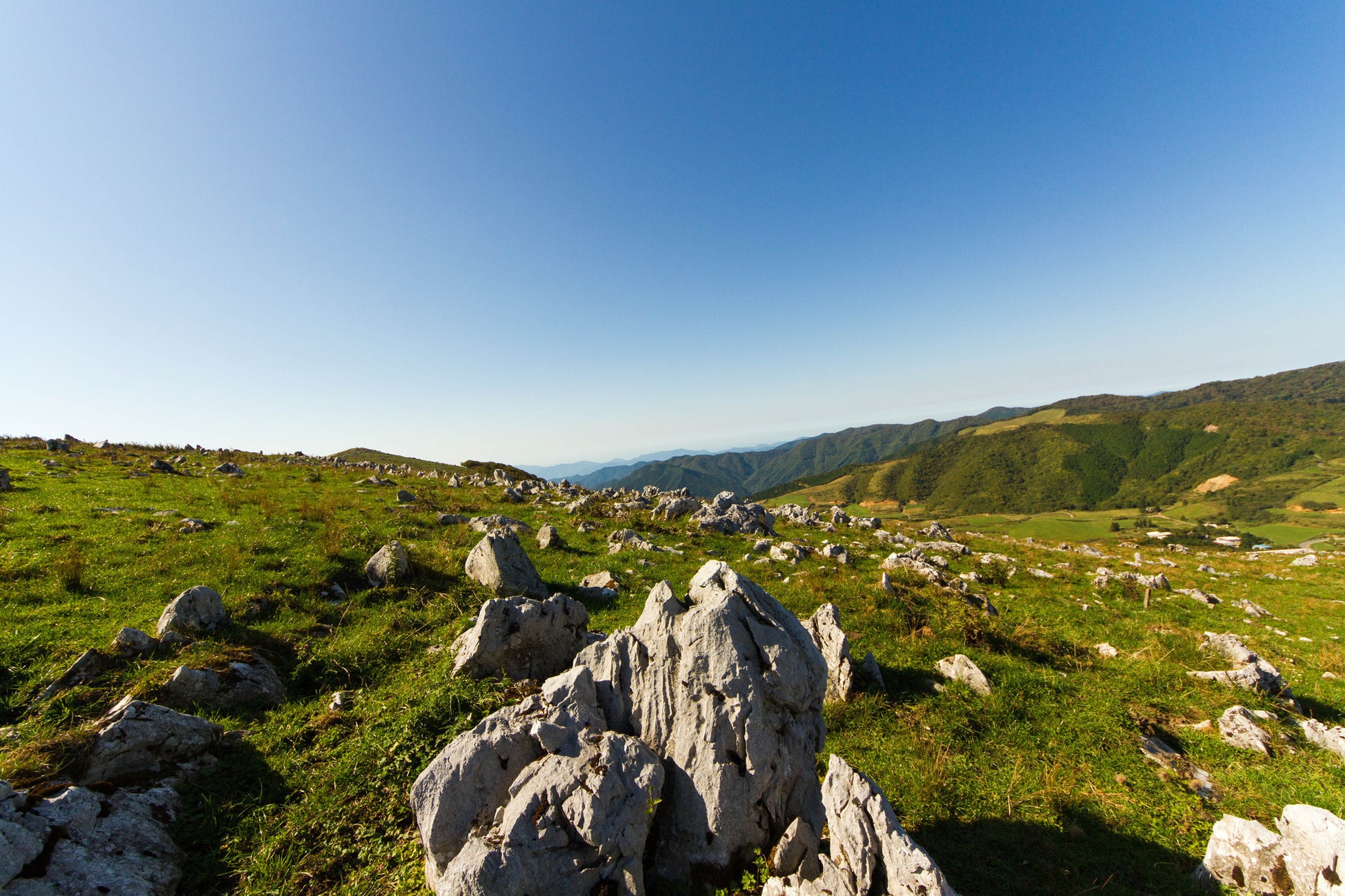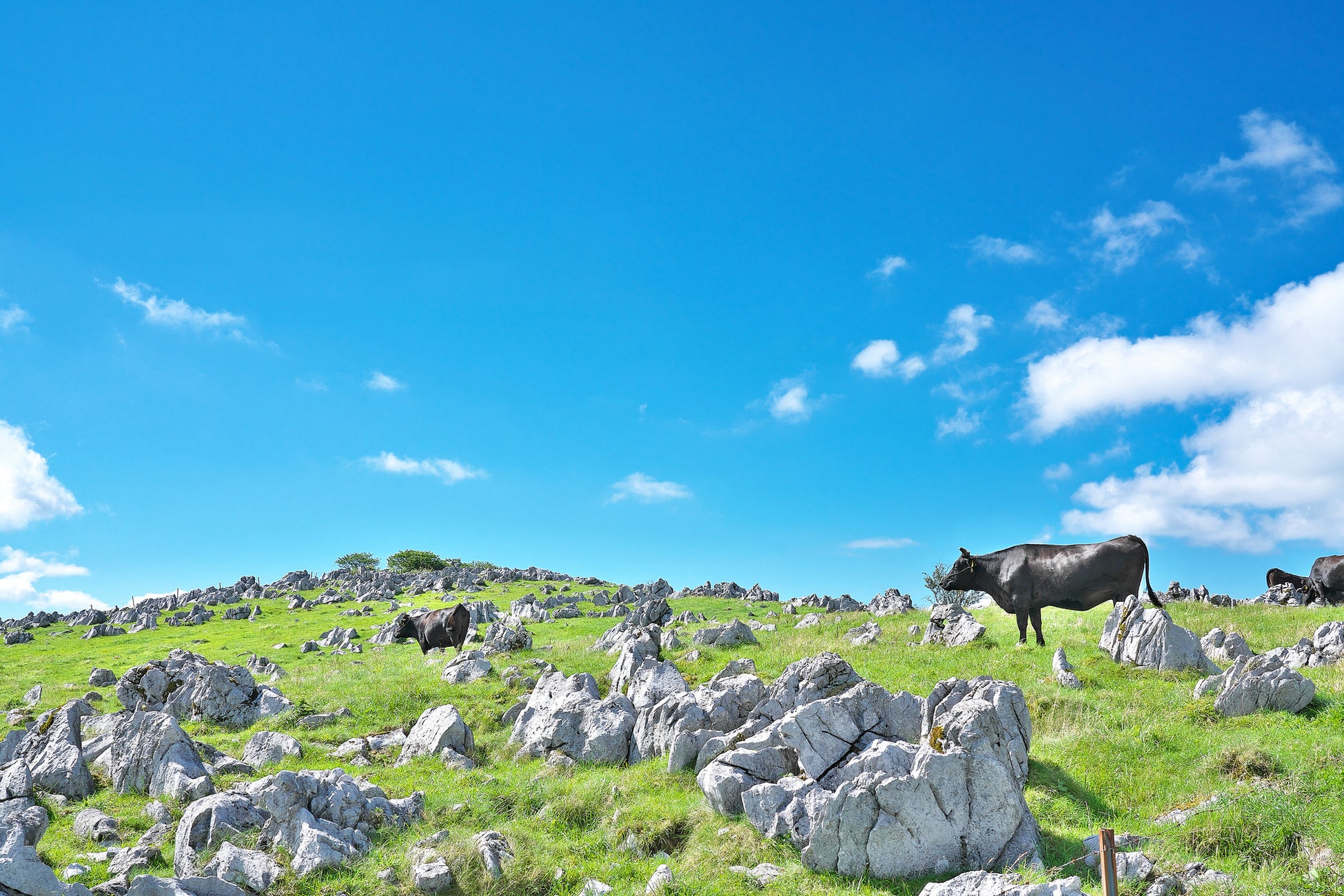 東西約25kmにおよぶカルスト台地で、日本三大カルストのひとつ。3つの中では最も標高の高い場所にあり、高原の雄大な景色や珍しい高山植物を楽しむことができます。白い岩肌の石灰岩、緑の草原、放牧された牛たちが織りなす牧歌的な風景は「日本のスイス」とも称され、訪れる人々を癒してくれます。晴れた日にはどこまでも続く四国連山が一望でき、雲の上の大パノラマが広がります。