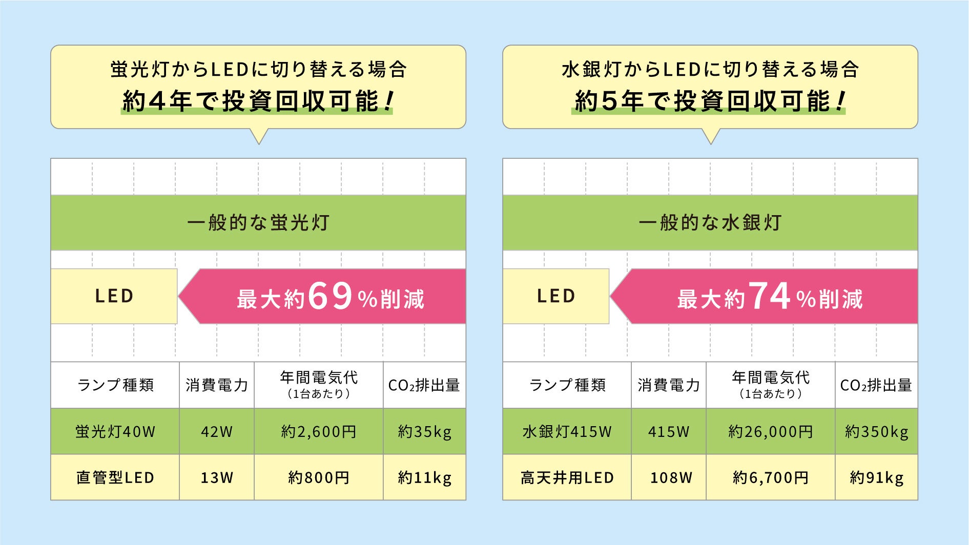 高効率LED照明の導入により、オフィスや商業施設などで使われている従来の蛍光灯や工場で使用されている水銀灯に比べて消費電力を大幅にカット。長期的な経費削減につながります。
