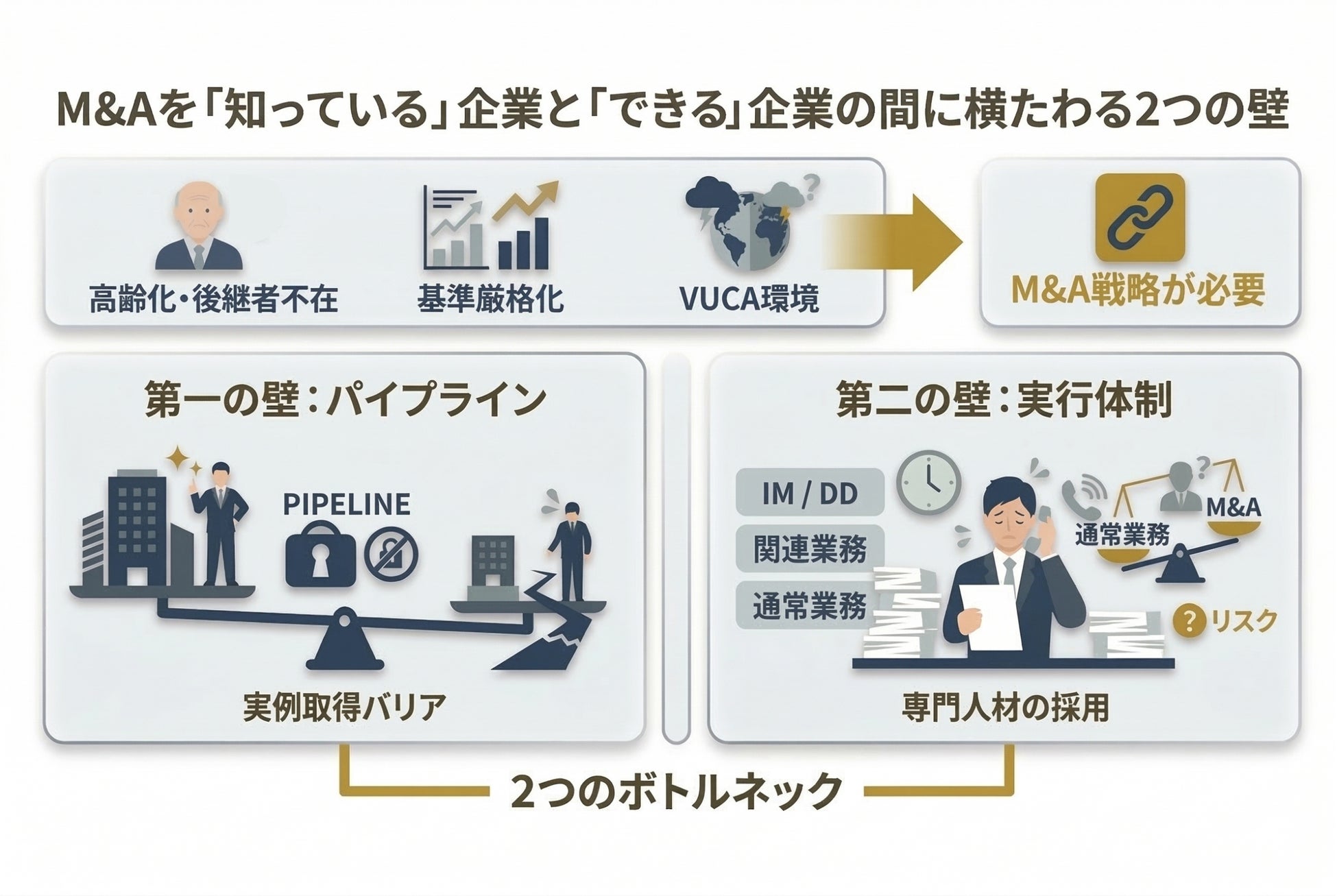 しかし、M&Aの推進を試みた多くの企業が2つの構造的な壁にぶつかります。
