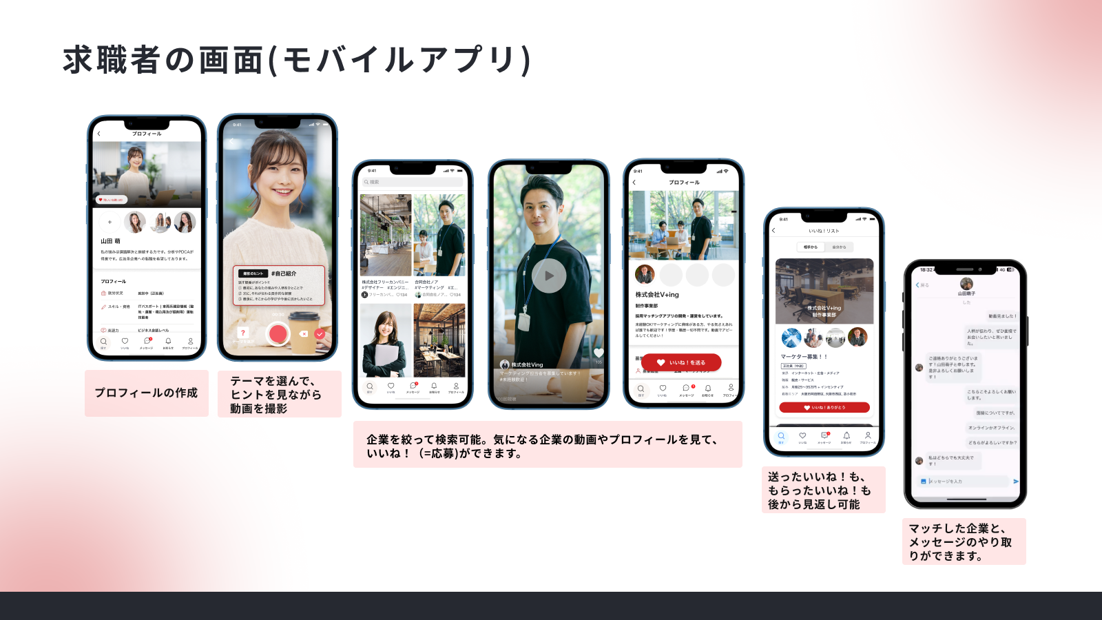 株式会社Vingは、企業と求職者がそれぞれ60秒以内のショート動画を通じて出会う、動画採用に特化したマッチングプラットフォームをリリースいたしました。
