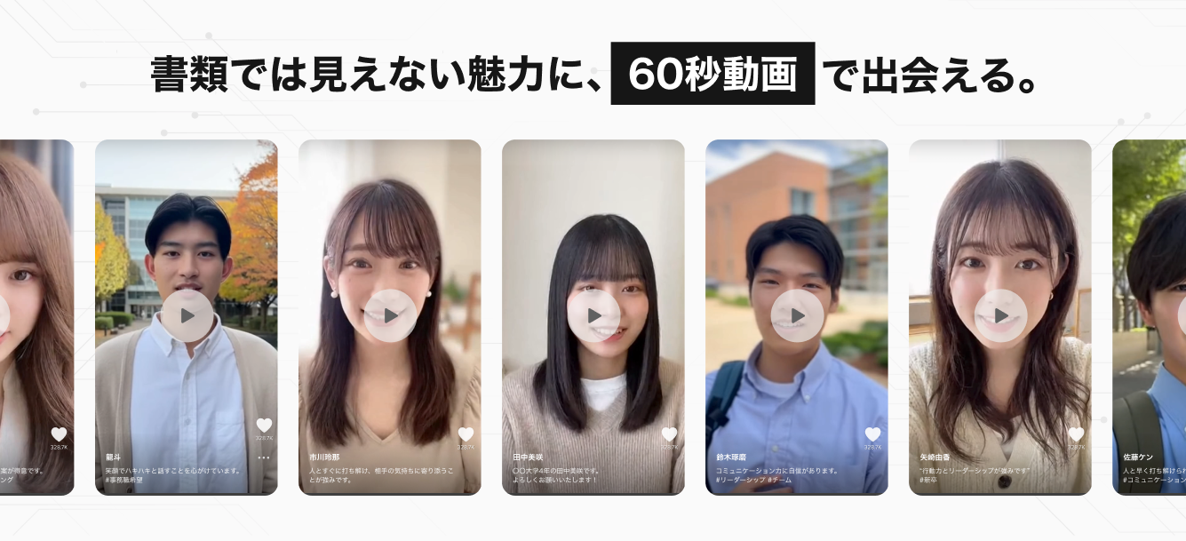 履歴書や職務経歴書では伝わらない「人柄・熱量・挑戦意欲」を60秒動画で可視化し、企業と求職者の本質的なマッチングを実現。
