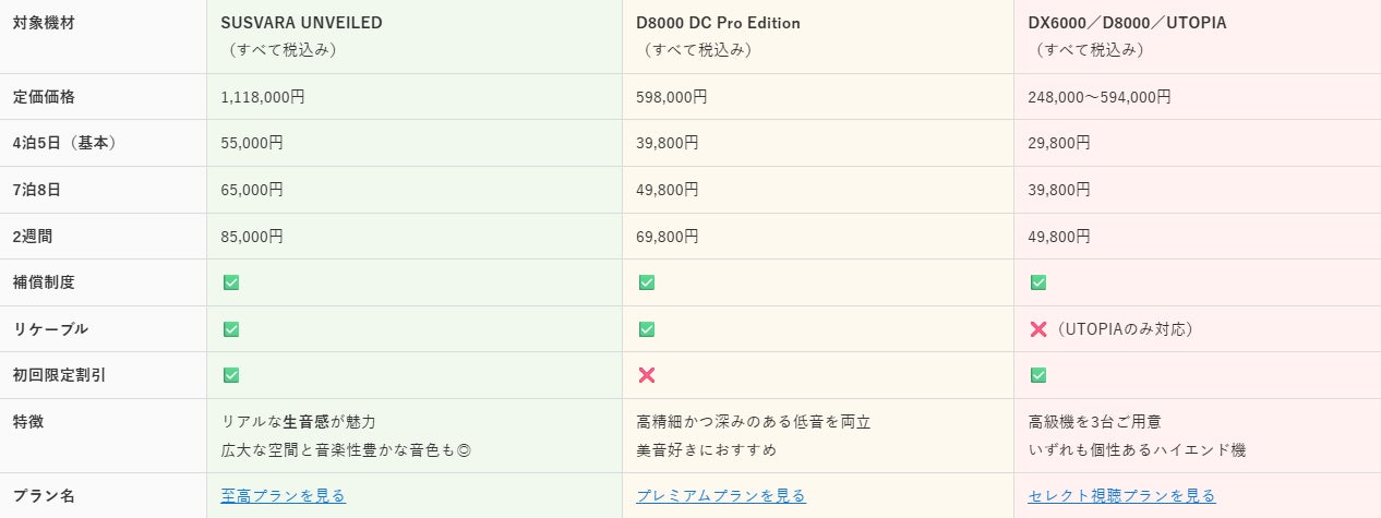 たとえばHIFIMAN SUSVARA UNVEILEDなら、定価1,118,000円→52,000円でレンタル可能です。