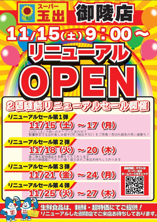 株式会社フライフィッシュが運営するスーパー玉出(本社:大阪市西成区)は、2025年11月15日(土) 朝9時より「スーパー玉出 御陵店」(大阪府堺市)をリニューアルオープンいたします。