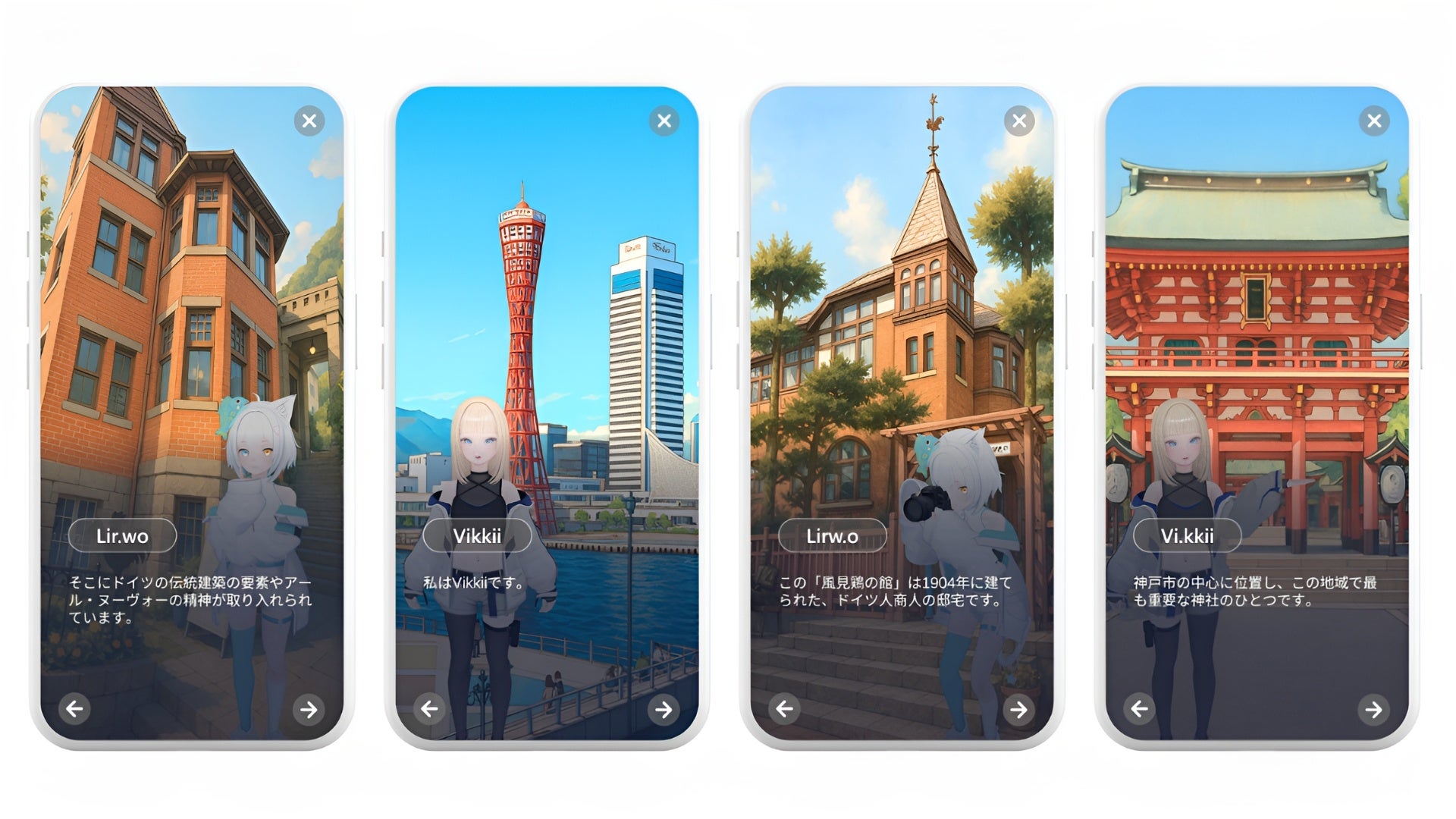 日本発のバーチャルアイドル Lirwo と VIKKii が案内役として登場。神戸の名所である北野異人館、生田神社、相楽園、南京町中華街、旧居留地十五番館を巡りながら、異国情緒あふれる建築や地域信仰、庭園景観、居留地文化をつなぎ合わせ、「国際港都」神戸ならではの多彩な文化を体感できます。本コースは、音楽分野に特化したVTuber音楽事務所・株式会社STAR Collectionとの共同開発により制作されました。
