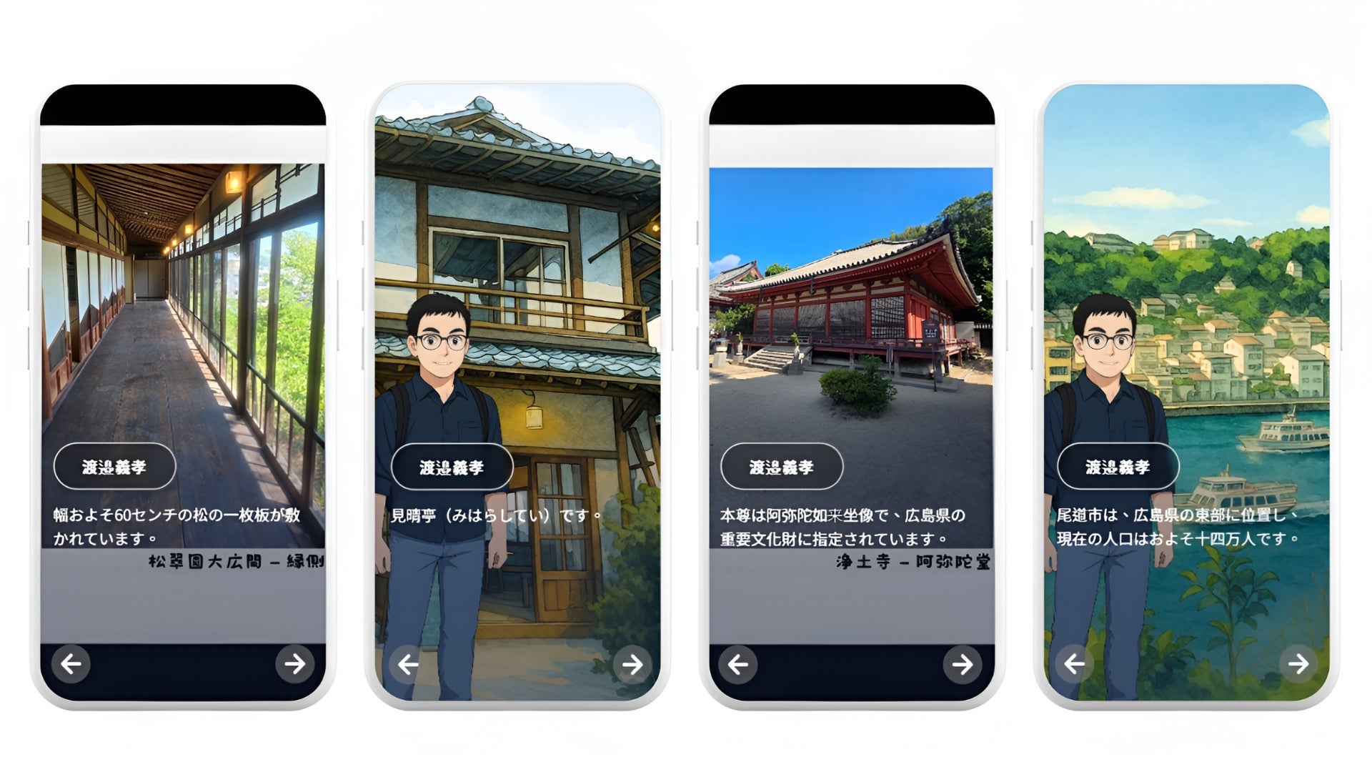 Hanalineは、音声・映像・文章・キャラクター/アバターを組み合わせた多様な形式の散策体験アプリです。通常の音声ガイドに加え、ストーリー型・ゲーム型にも対応し、必要に応じてAR/VR機能を導入することで、より高い没入感とインタラクティブ性を実現します。