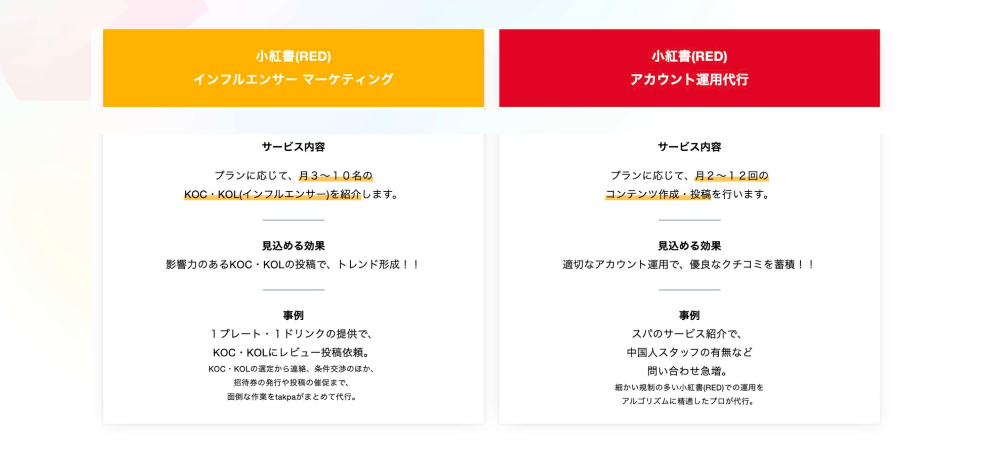 しかしながら、中国本土ではネット規制によりInstagramやGoogleレビューなど一般的な海外SNSが閲覧できず、従来のデジタル施策では情報が届きません。そのため、中国人観光客にリーチするためには、中国独自のSNSプラットフォームを活用したマーケティングが欠かせません。合同会社takpaでは、小紅書(RED/RED Note)の活用やインフルエンサーマーケティング(KOC・KOL)を通して、従来のSNSでは届かなかった中国人インバウンドへのマーケティングおよびブランディング強化を提案しています。