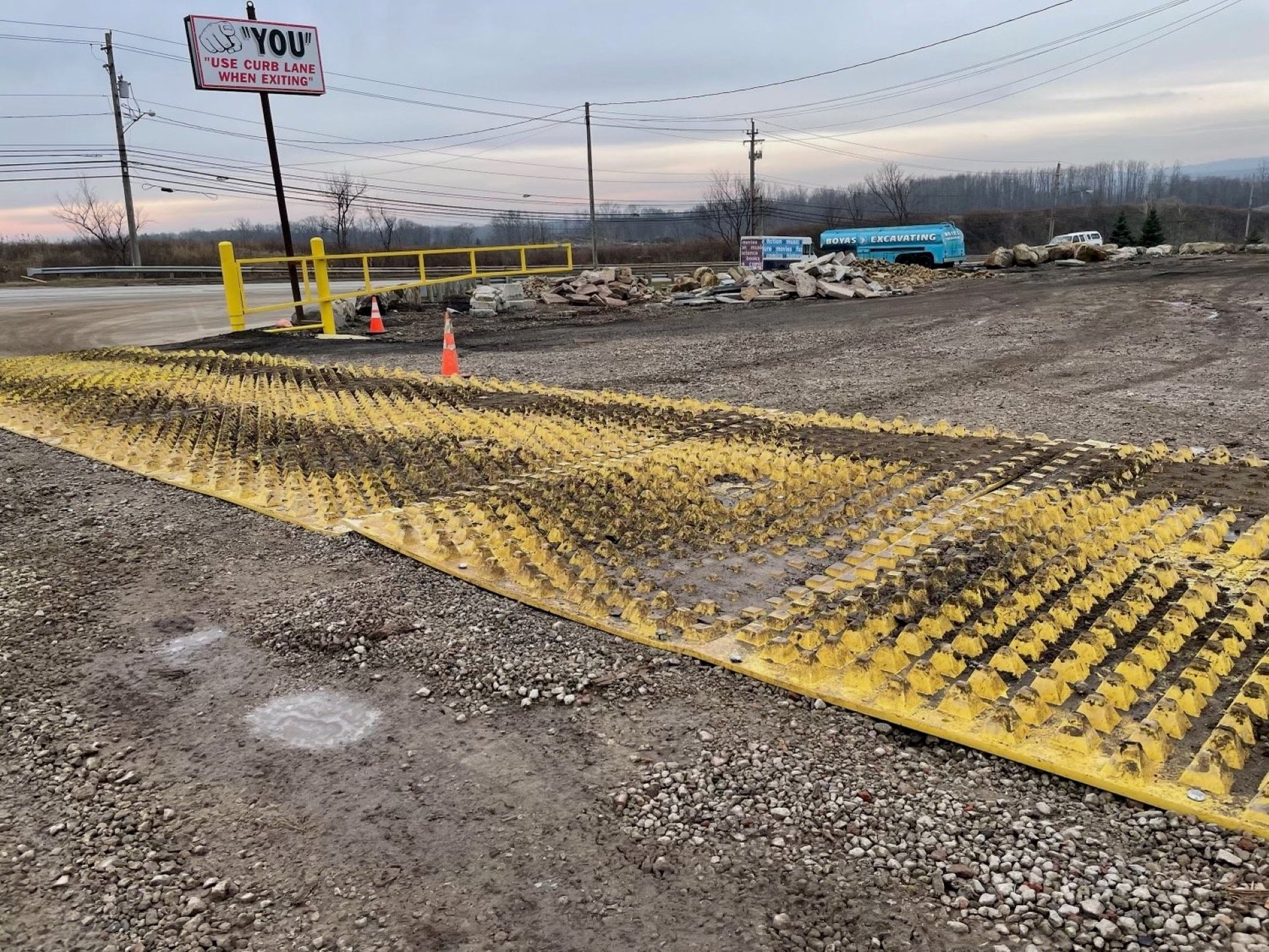 FODSマットは、建設現場や工場などの入退場口に設置するだけで、重機や車両のタイヤに付着した泥や土砂を効果的に除去する革新的なシステムです。砕石敷設工法や水洗浄設備とは異なり、水を使わず、砕石も不要、環境規制や条例に適合した全く新しいアプローチを採用しています。