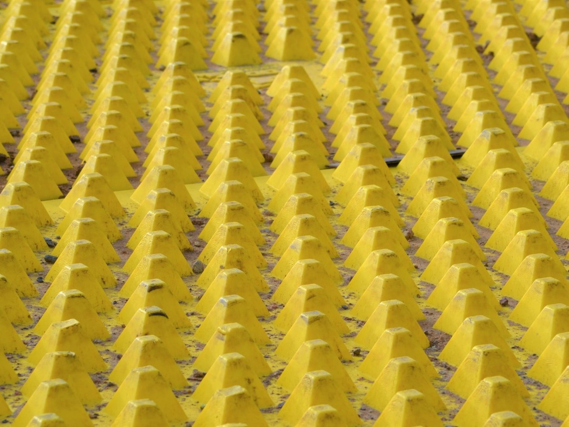 *³ ピラミッド状突起の洗浄メカニズム:車両がマット上を通過する際、表面のピラミッド状突起がタイヤ溝をわずかに変形させることで、溝に詰まった土砂の塊を物理的に押し出す仕組み。水を使わずに効果的な洗浄を実現する特許技術。