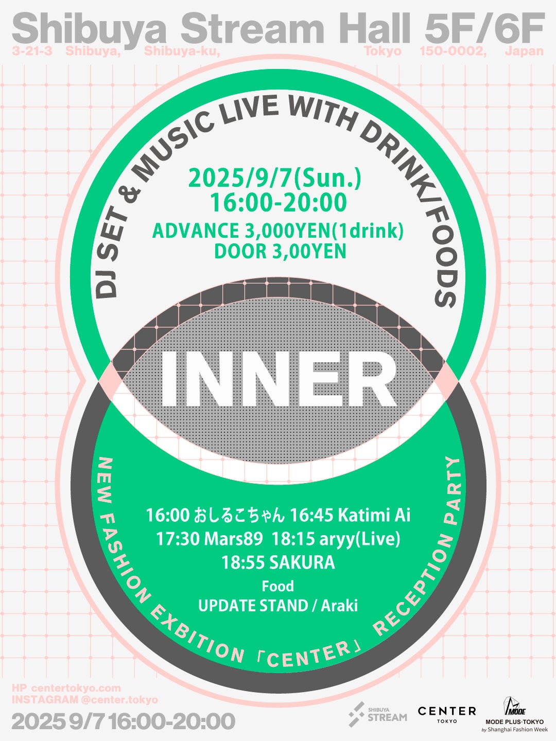 初日の7日(日)は、一般入場が可能なマーケットデーとし、POP UP でブランドの世界観を体験できるほか、6F ホールでは音楽イベント&レセプションパーティー「INNER」も開催。一般の方も参加可能なオープンイベントで、今をときめくアーティスト5名が出演する音楽イベントを中心に、ZINEの販売やドリンク・フードを交え、ファッションとカルチャーが自由に交わる空間をつくります。
