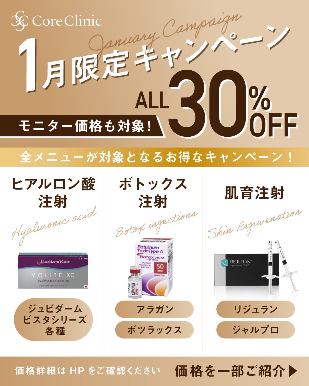 名古屋・栄エリアに位置する美容外科・美容皮膚科「Core Clinic(コアクリニック)」では、2026年1月限定で、ヒアルロン酸、ボトックス、肌育注射(リジュラン・ジャルプロ)を対象とした全注射施術30%OFFキャンペーンを実施いたします。