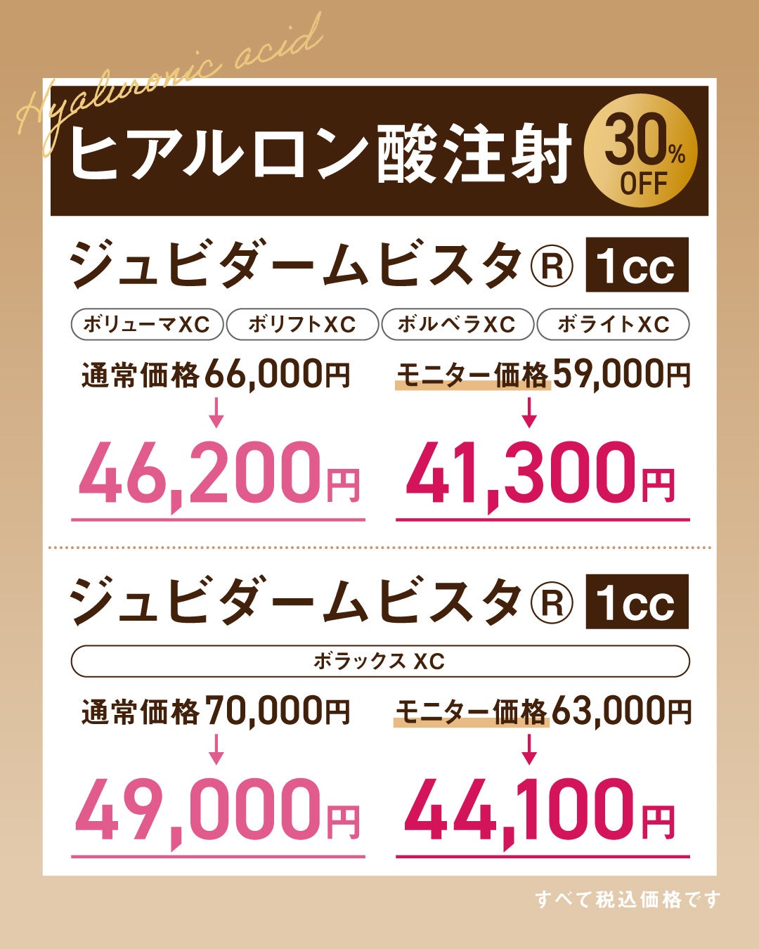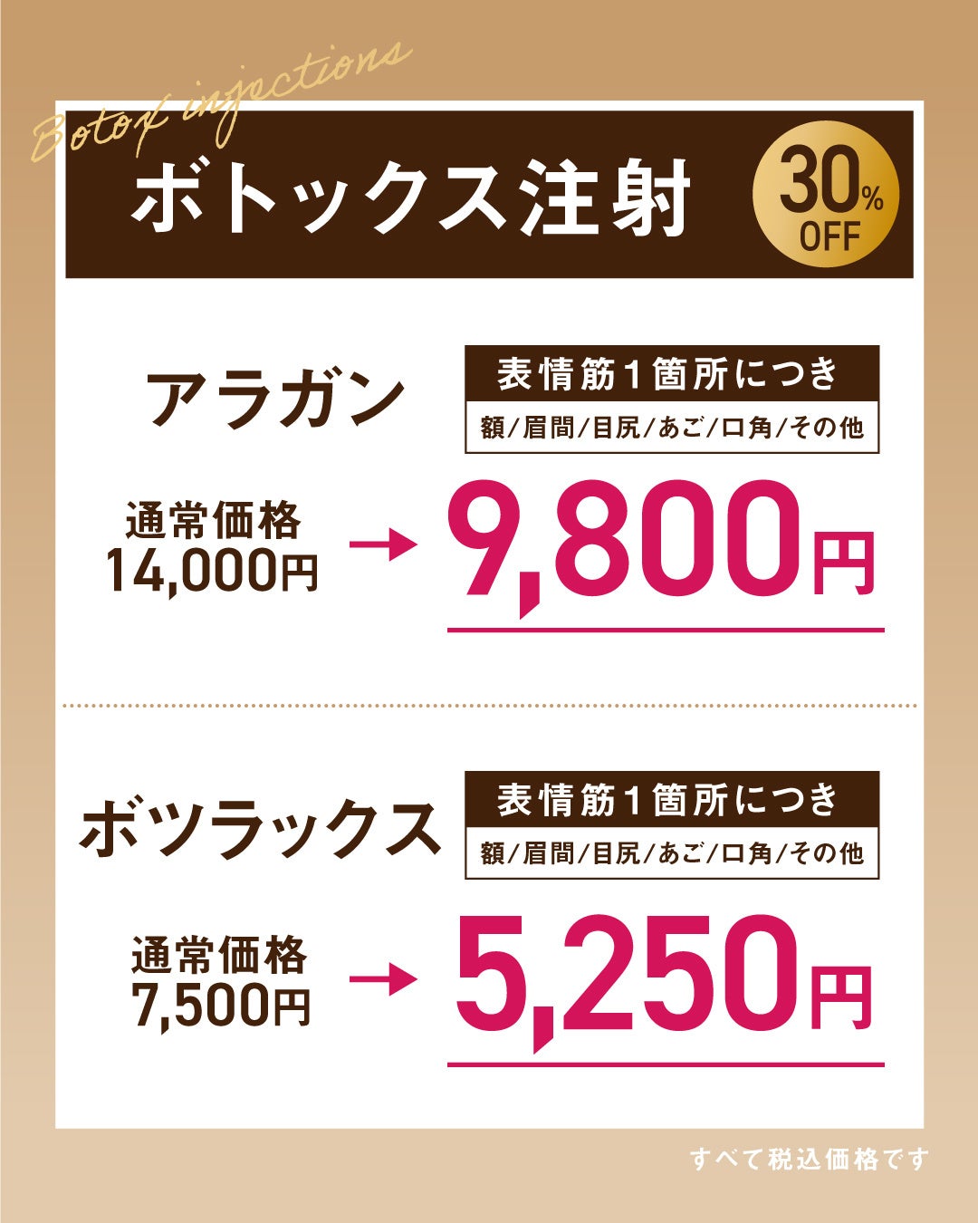 上記すべての注射施術が、通常価格より30%OFFで受けられます。