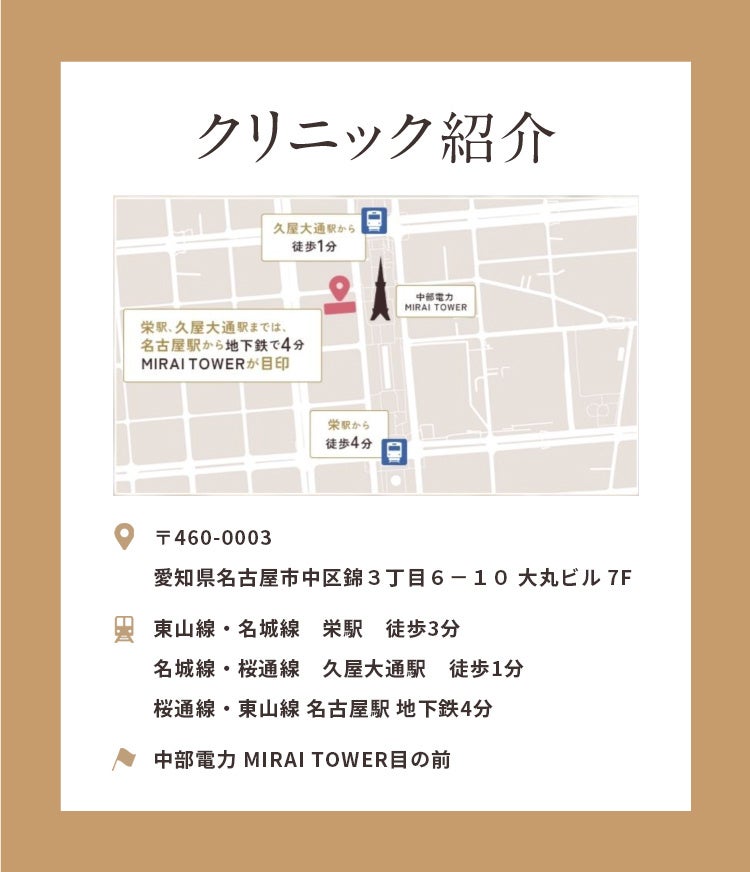 また、Core Clinicは栄・久屋大通エリアからアクセスしやすい立地にあり、安心して通い続けられる環境づくりを大切にしています。
