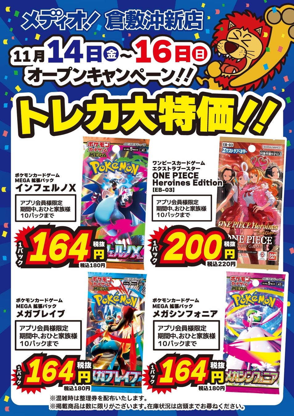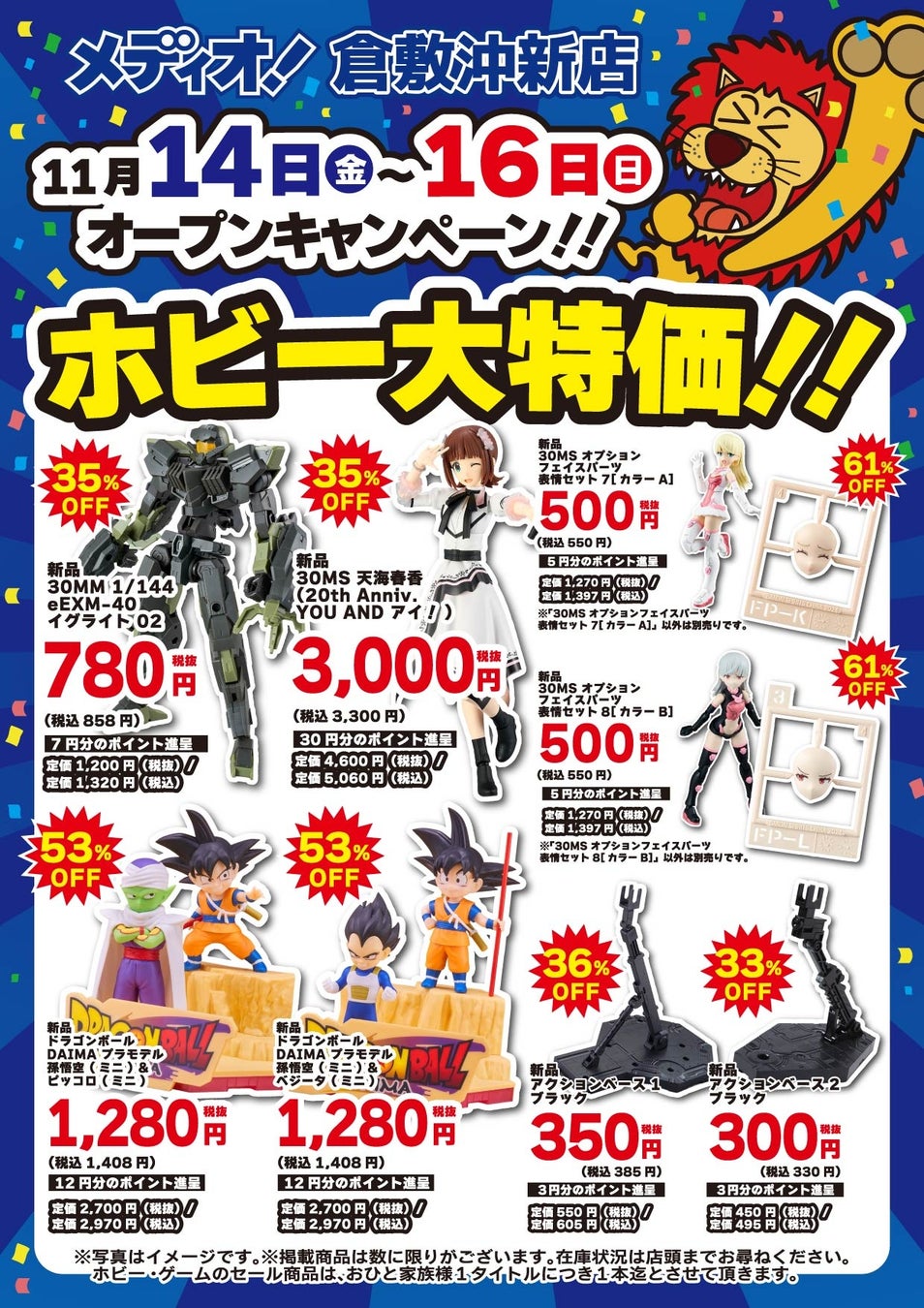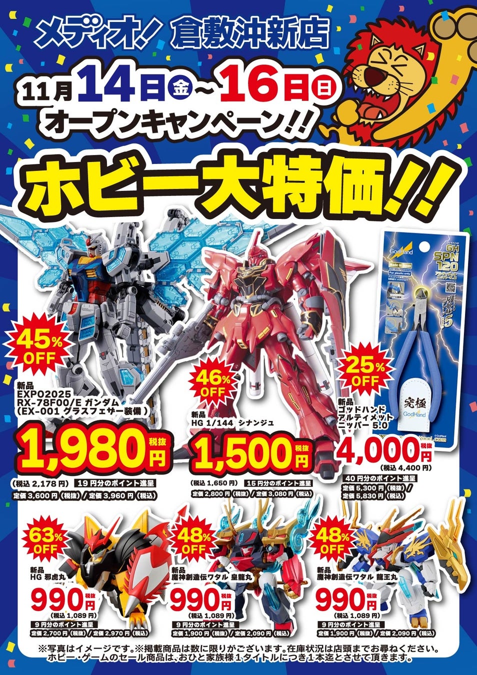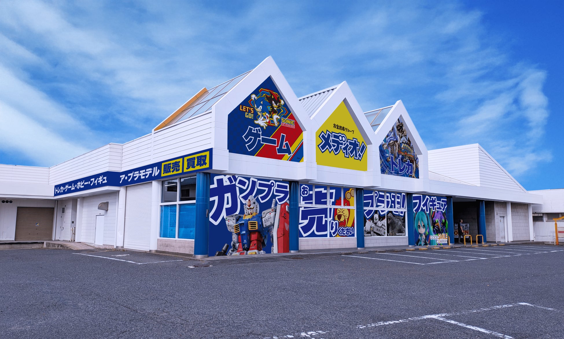 この度オープンする「メディオ!倉敷沖新店」は、既存の「メディオ!沖新店」に対しホビーの売場は3倍、トレーディングカードの売場は2倍に拡張。更にゲーム機、ゲームソフト、ゲーミング家電も新規で取り扱い、リニューアルオープンする店舗です。