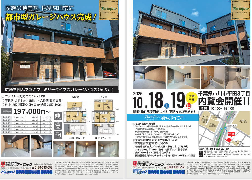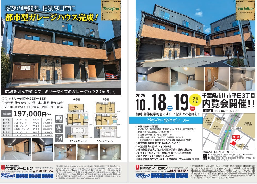 外環道「市川中央IC」から600m・約2分、JR総武線・都営新宿線「本八幡」、京成線「菅野」「京成八幡」など5駅4路線が利用可能な交通至便の地に賃貸ガレージハウス「Portofino(ポルトフィーノ)」が堂々完成しました。この度、賃貸募集の開始に伴い現地完成見学会を実施いたします。外環道側道から少し奥まった中庭を囲んで佇む、落ち着いた雰囲気のインナーガレージ付き3階建て(一部2階建て)の6世帯。平田・菅野地区は教育施設が整った歴史ある文教地区にあって、都心方面への通勤・通学や買い物など生活利便性の高いエリアとなっております。ビジネス・レジャーの拠点としても最高のロケーションとクオリティを、この機会にぜひ現地でお確かめください。
