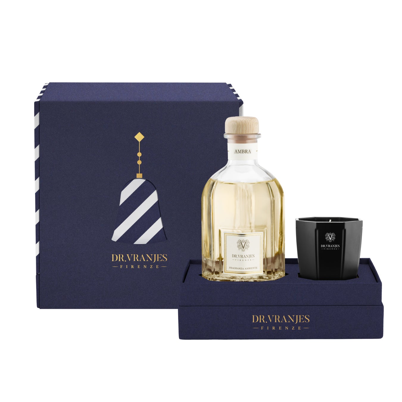 250mlのディフューザーと手のひらに収まるミニキャンドルを、ベル型のオーナメントモチーフの小窓が可愛らしいネイビーボックスにセットしました。香りは、落ち着きと気品あふれるオリエンタルノート・アンバーと、ブランドのアイコンでもあるロッソ ノービレの2種をご用意しております。