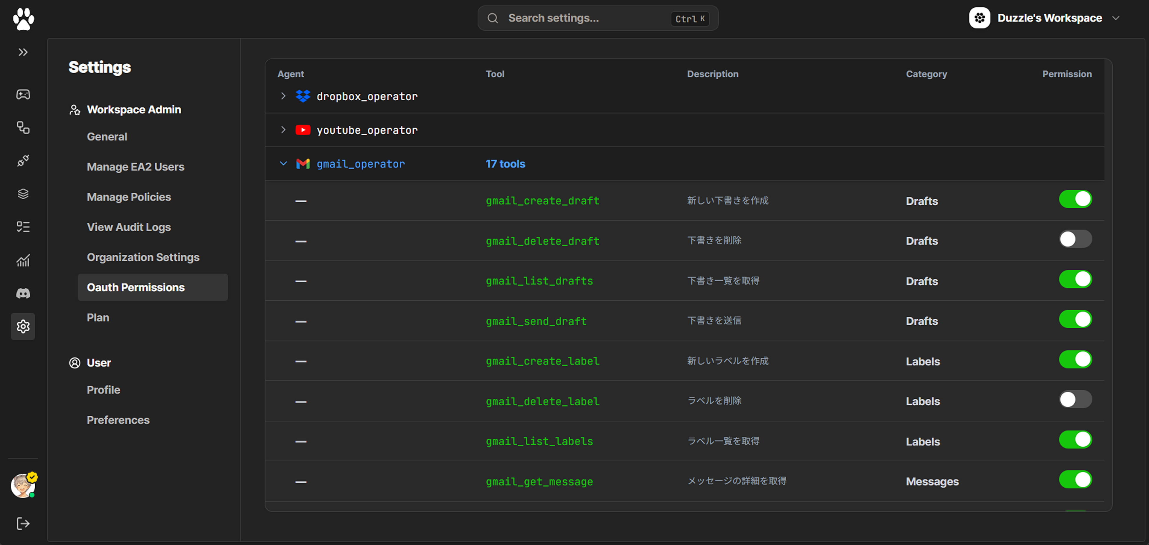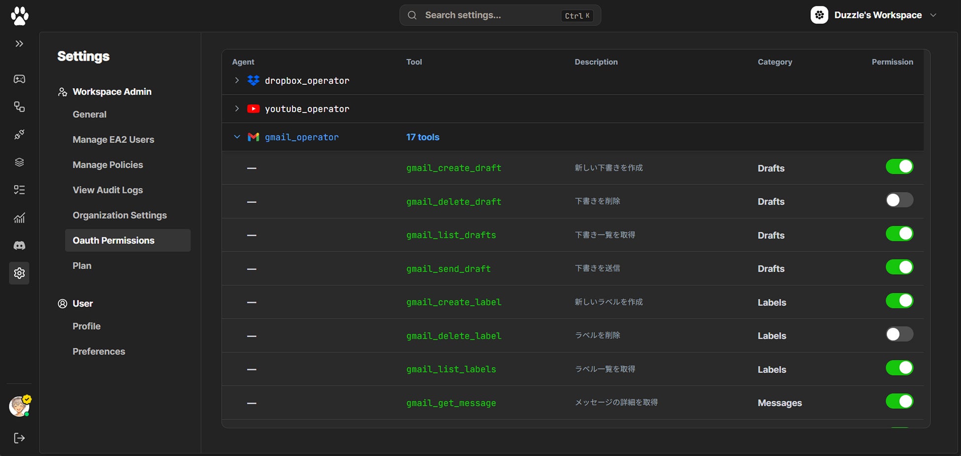 安全で標準化された認証プロトコルにより、ユーザーのセキュリティを確保しながら、シームレスなアクセス管理を実現します。 APIキーを直接管理するリスクを排除し、数回のクリックだけでSlack、Google Drive、Jiraなどの外部ツールと安全に連携できます。企業情報のセキュリティを守りながら、AIによるツール操作を実現しました。