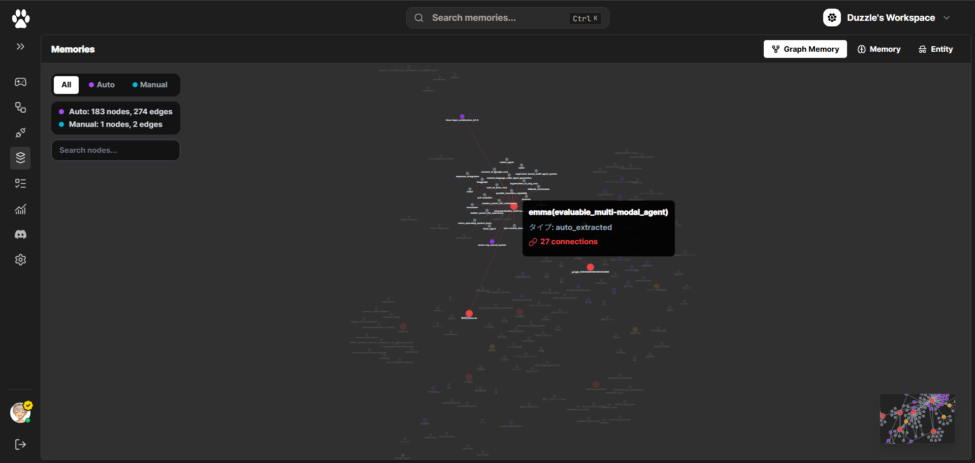 エージェントの経験と学習を永続的に保存し、継続的な成長と知識の蓄積を実現します。 「A社の田中さん」「進行中のプロジェクトX」といったエンティティ間の関係性を理解・記憶します。次回以降の指示では文脈を一から説明する必要がなく、阿吽の呼吸で業務をサポートします。