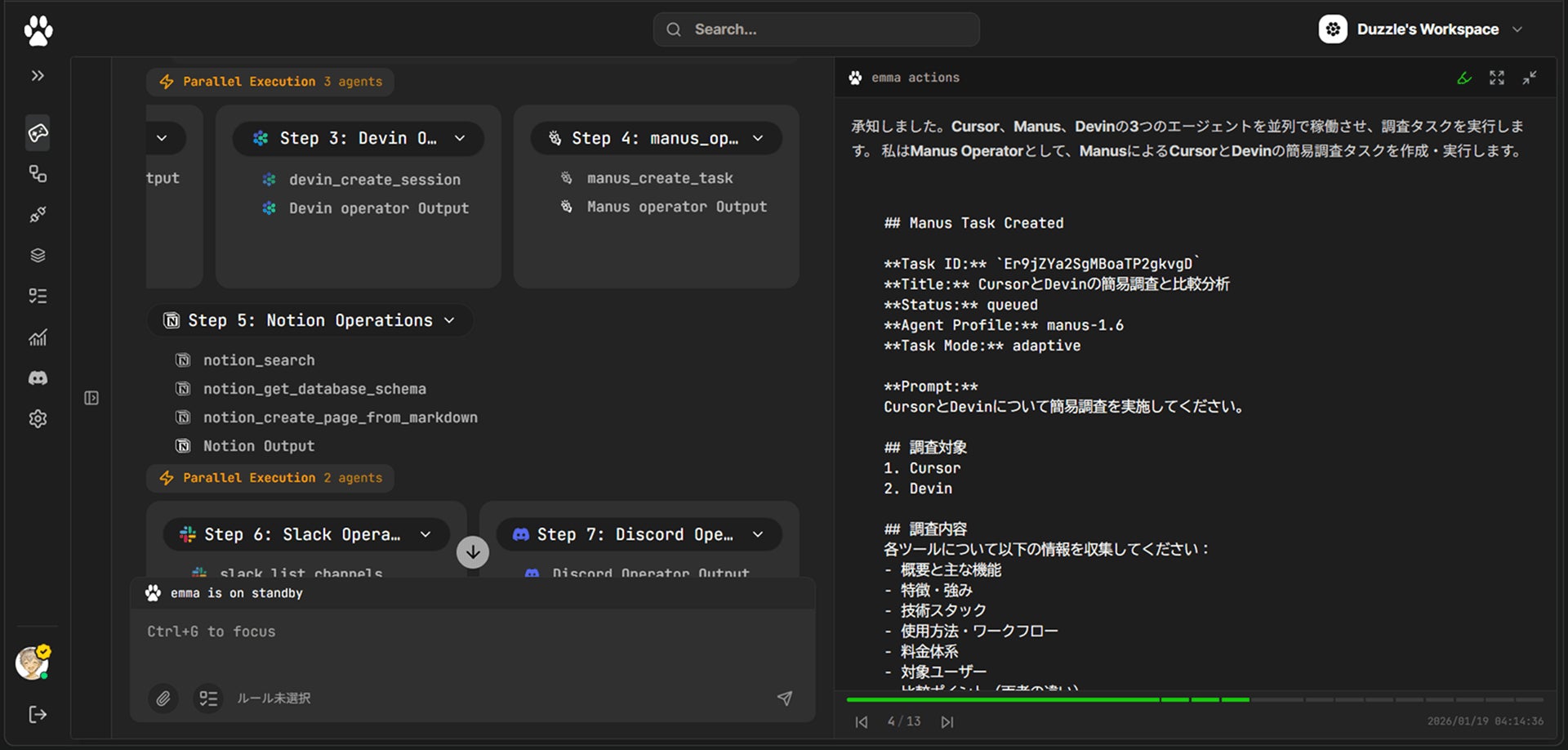 チャット形式で「Slackに今日の進捗を投稿して」「Notionにレポートとして送って」など、普段使う言葉でAIに指示を出すだけで、適切なエージェントが自動選択され、タスクを実行します。