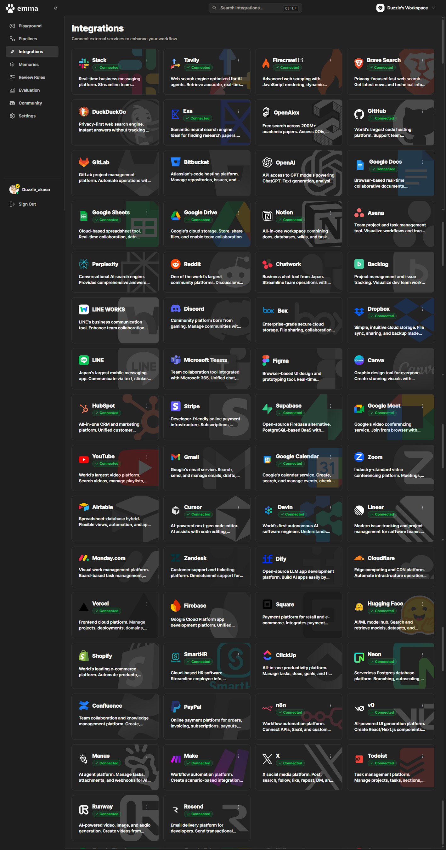 「emma」は、「指示するだけで、AIが勝手に仕事をしてくれる」をコンセプトに開発された、監査可能なマルチモーダルエージェントプラットフォームです。SlackやNotion、GitHubなど70以上の外部サービスと連携し、複雑な業務プロセスを自動化します。