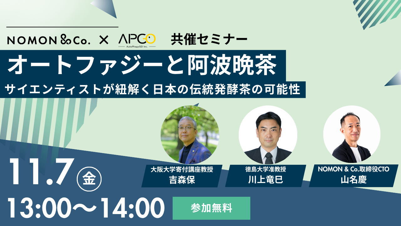 オートファジー研究の世界的権威である吉森保教授、阿波晩茶に造詣が深い川上准教授、NOMON & Co.の技術責任者である山名が登壇します。