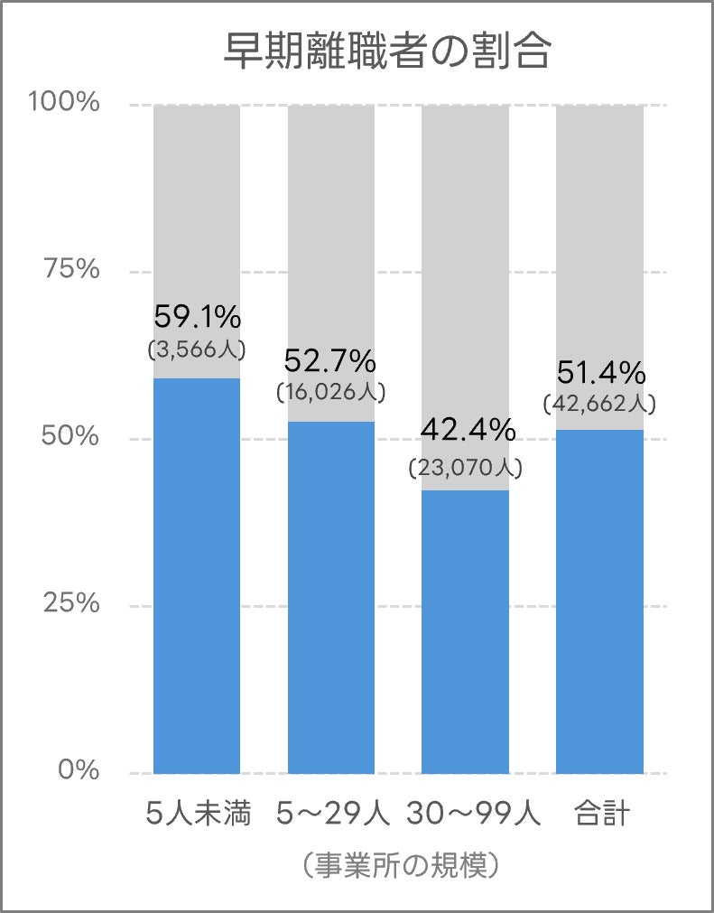 厚生労働省が発表した「新規学卒者の離職状況[ii]」によると、新卒で入社した学生のうち、3年以内に離職した早期離職者は34.9%に上る結果となっています。さらに、企業の規模が100人未満の事業所の場合、割合は51.4%とさらに高くなり、およそ2人に1人が早期離職に至っている状況です。