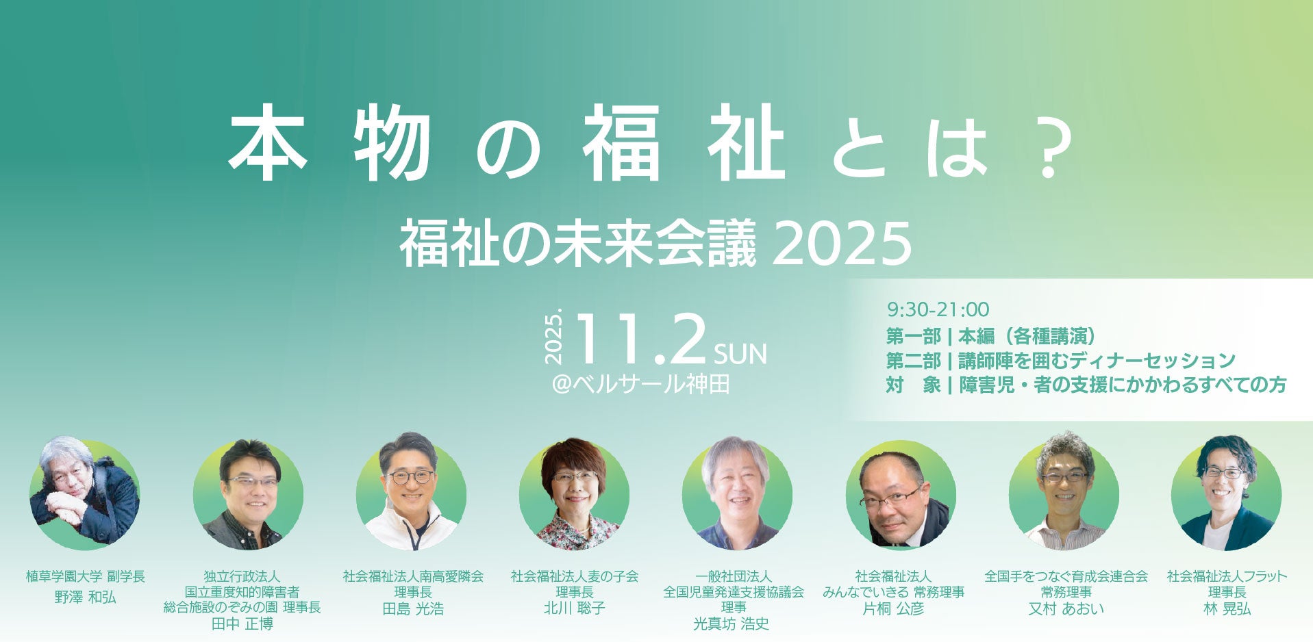 福祉の未来会議実行委員会(事務局:社会福祉法人フラット内[千葉県白井市/理事長:林晃弘] パートナー企業:株式会社For ALL[代表取締役:立松和樹])は、2025年11月2日(日)に東京都千代田区のベルサール神田で、専門家を招いたトークイベント「福祉の未来会議2025~本物の福祉とは?~」を開催します。当日は「本物の福祉」を現場で体現してきた第一人者の方々による講演、パネルディスカッション、ディナーセッションを行います。