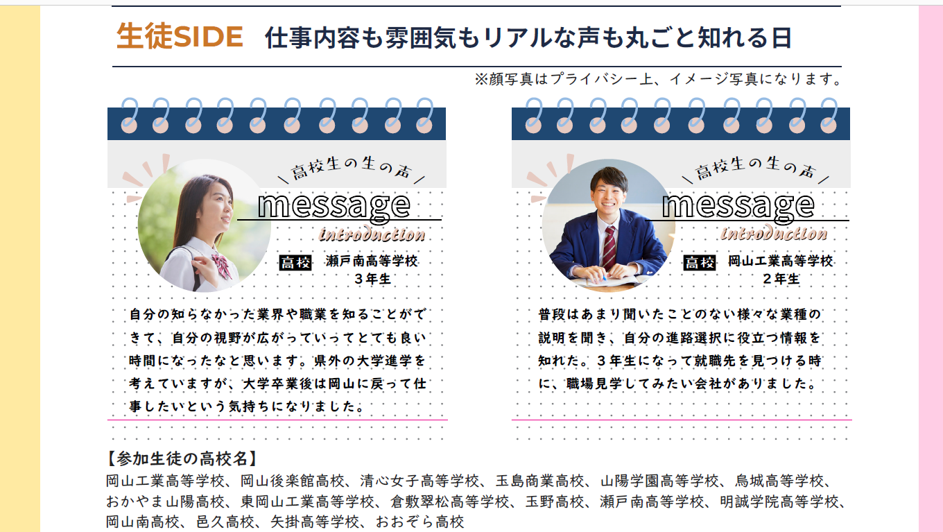 岡山県内の高校1年生~3年生対象、服装自由、友達同士の参加OK。保護者の方も参加可能です。 |