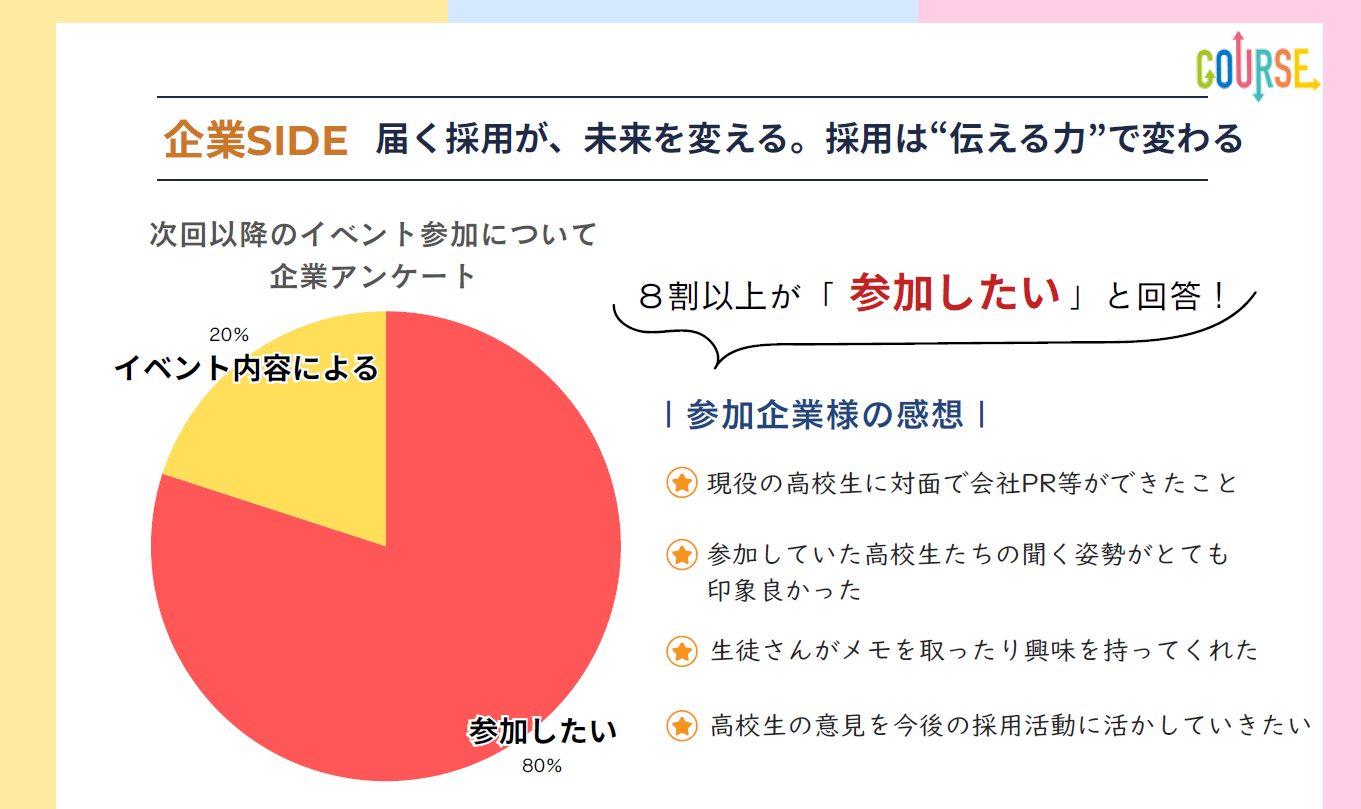 アンケートでは「企業のリアルな話が聞けて、働くイメージが湧いた」「自分が何を大切にしたいか見えてきた」といった声が相次ぎ、参加者の進路に対する前向きな変化が確認されています。