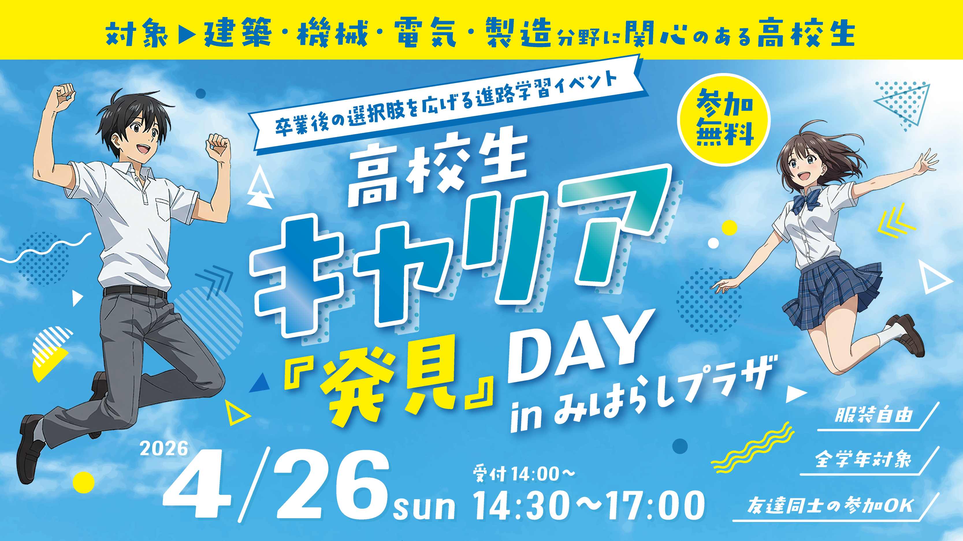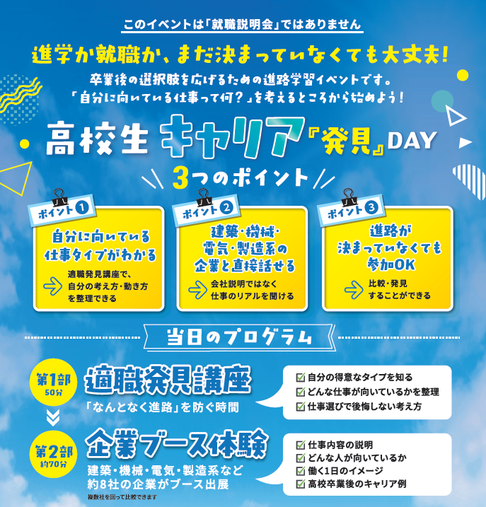 高校生のための未来づくり実行委員会(株式会社プログレス内)は、2026年4月26日(日)、高校生向けキャリアイベント「じぶん力スクール」の第2回を開催いたします。 第1回では岡山市・倉敷市をはじめ県内広域から27校の高校生が集結。「進路への不安が解消された」と高い評価を得ました。 今回の第2回は、ニーズの高い【建築・機械・電気・製造】の4分野に特化。地元を支える技術系企業8社とともに、より深い職業理解と自己分析や適職診断を組み合わせた「濃密な半日プログラム」へとアップデートして実施します。