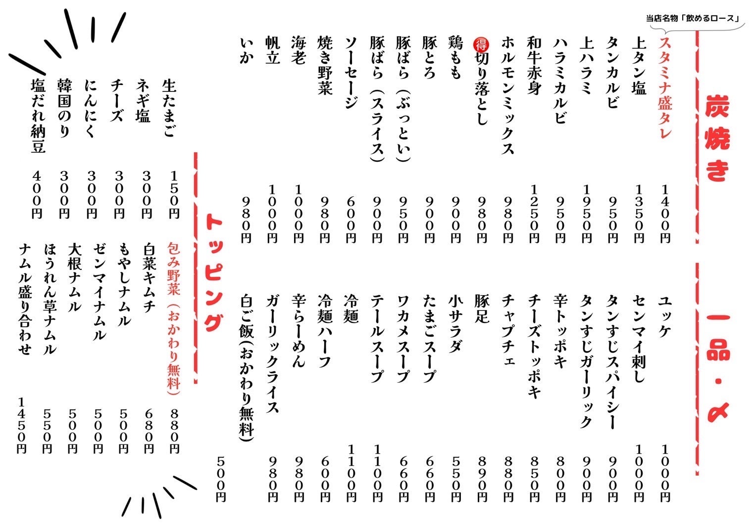 当店の名物で「飲めるロース」として人気のスタミナ盛りをはじめ、定番のタンやハラミ、鶏ももや豚トロ、海鮮を、豊富なトッピングと組み合わせて、自分だけの"最強の一口"を楽しむことができます。