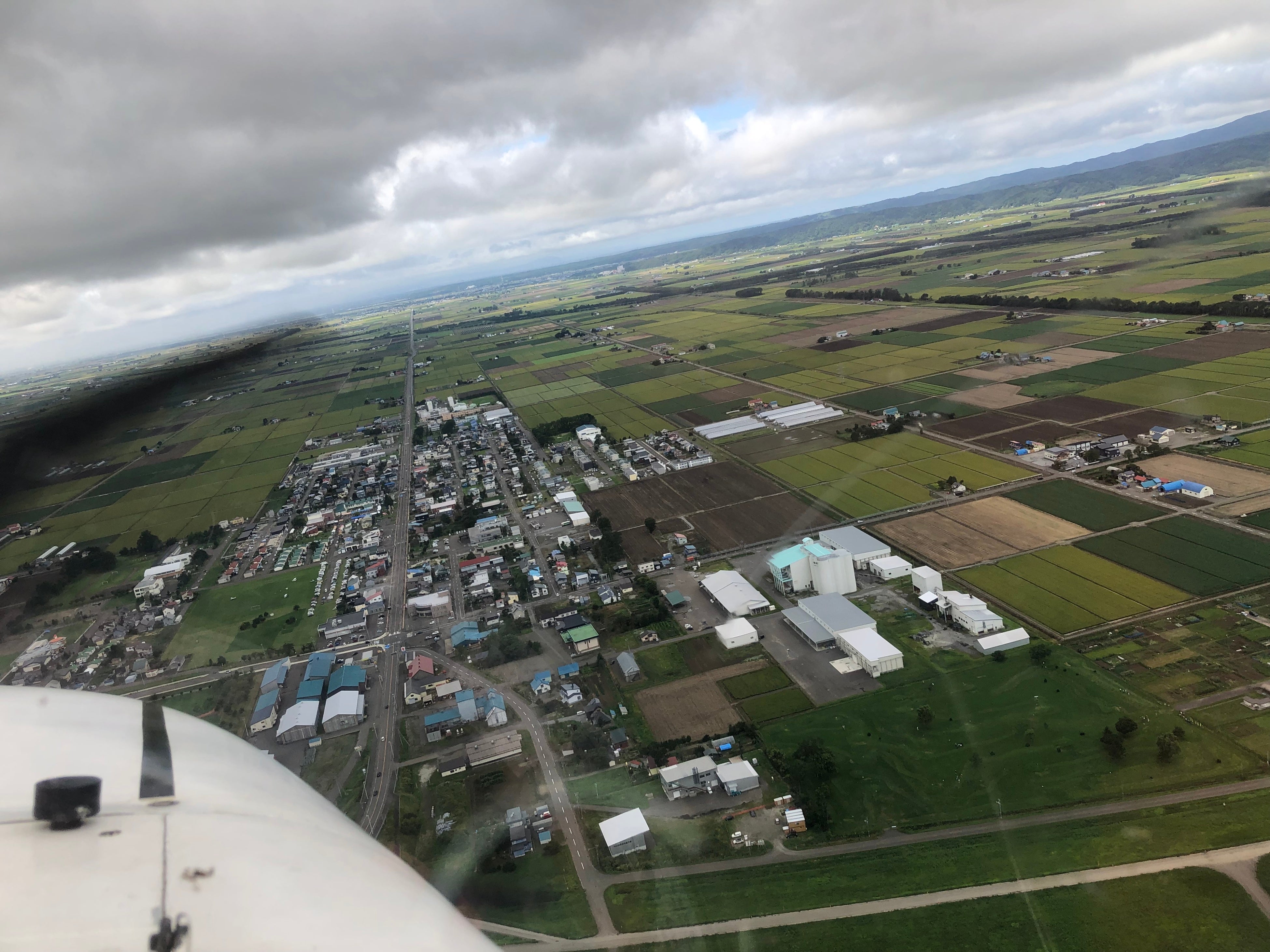 上空からみた新篠津は時期によって景色が変わります。田植え後の緑の大平原。花畑が織り成すパッチワーク。収穫期の黄金色に広がる一枚の絵のような風景を見ることができます。遠くには札幌の街並みや山々がみえ北海道の雄大な景色を一望できます。