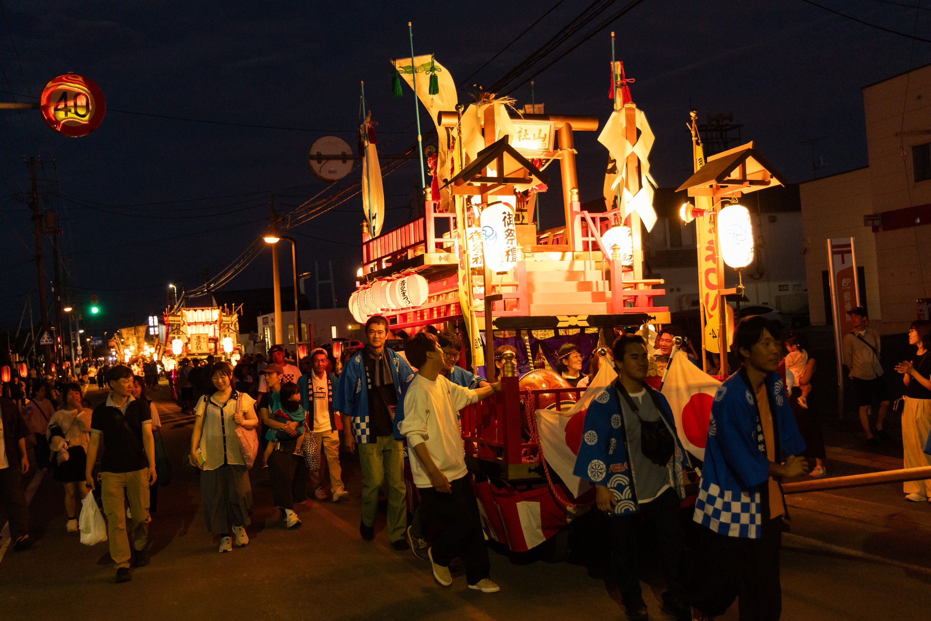 1979年に第1回がスタートした、新篠津村自治センター駐車場で開催される村最大の祭りです。自治センターの壁に描かれた北海道最大級の巨大壁画(2025年壁画家Kensuke Takahashi作)の前で繰り広げられる様々なステージメインイベントの他、気球体験等「空のまち」ならではの体験や街馬車等様々な体験ができます。メインイベントは道内有数の巨大な山車パレード。宝船やねぶた絵、巨大魚の姿を彩った山車がメインストリートを練り歩き、花火が祭りの最後を締めます。