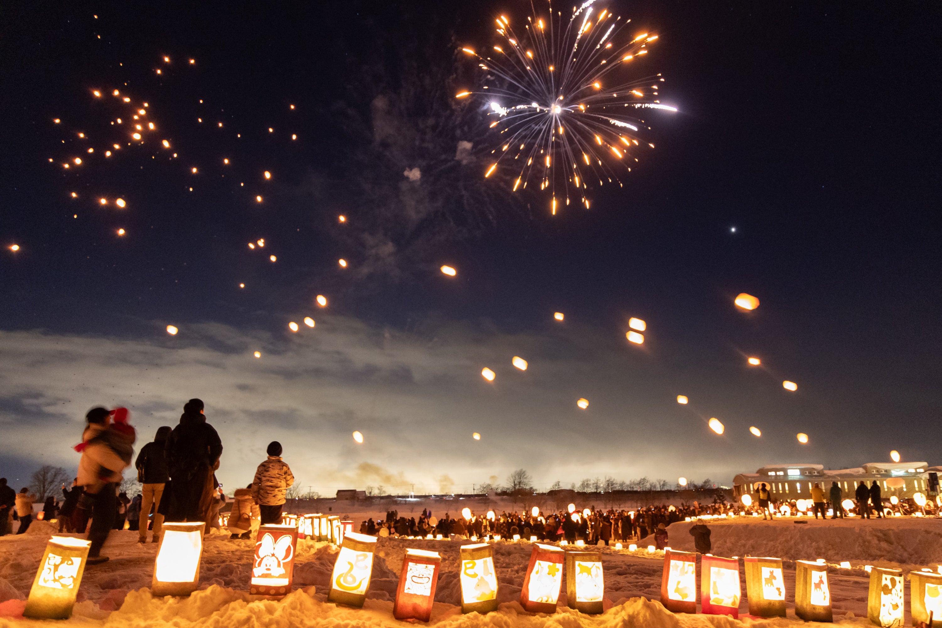 新篠津天灯(ランタン)祭りは2021年に始まった、人気のイベントです。ランタンとはいわば燃料を付けた紙風船。願い事を書いて飛ばすと願い事が叶うといわれる、海外では「コムローイ」等と呼ばれ台湾や東南アジアでも人気のお祭りです。