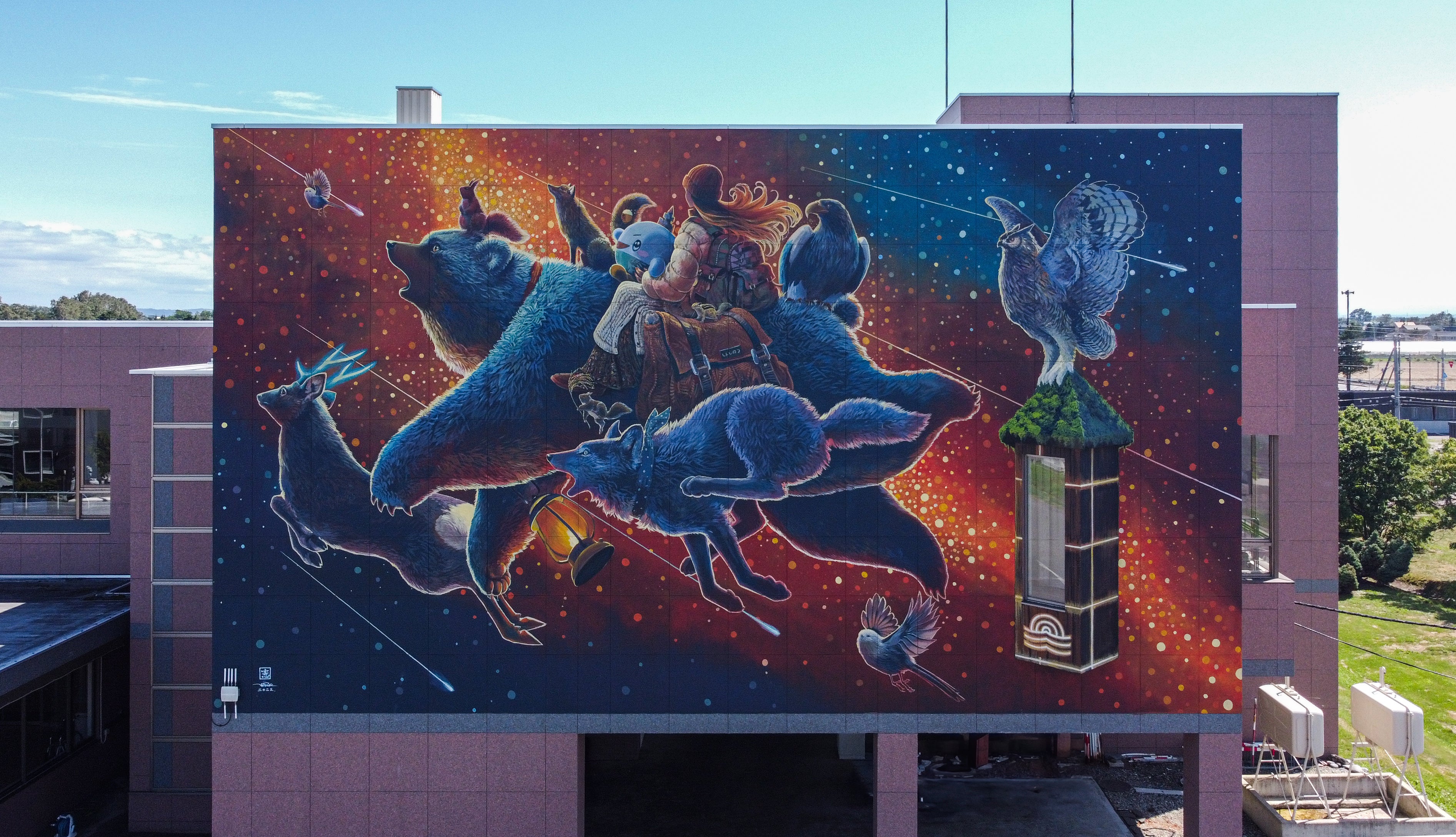 「空のまち」新篠津村の芸術はストリート(青空)アート。自然風景が素晴らしい新篠津村は街中の景観にも力を入れております。2023年から地域おこし協力隊の企画でスタートした事業で、毎年著名なストリートアーティストや壁画家を招聘し、村のメインストリートの電話ボックスや農業倉庫に壁画を制作。2025年には北海道最大級となる作品が自治センターに完成(作:Kensuke Takahashi/共催:JAPAN AX PROJECT株式会社)。10年後はハワイのカカアコ地区のような世界中のストリートアートを集めた通りになるかもしれません。