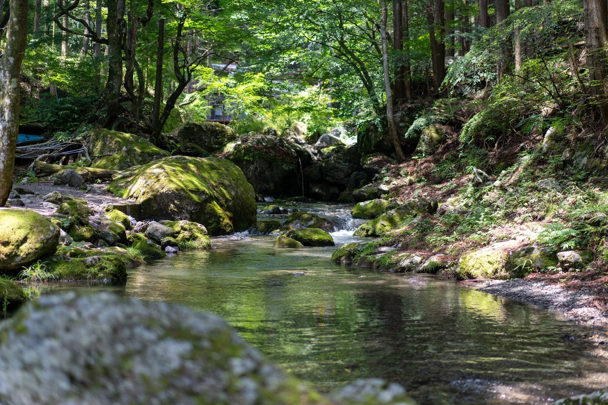 都心から1時間強のロケーションにありながら、透き通った清流と深い森に囲まれた非日常空間で、「自然と響きあい、心身を解きほぐす時間」を提供します。