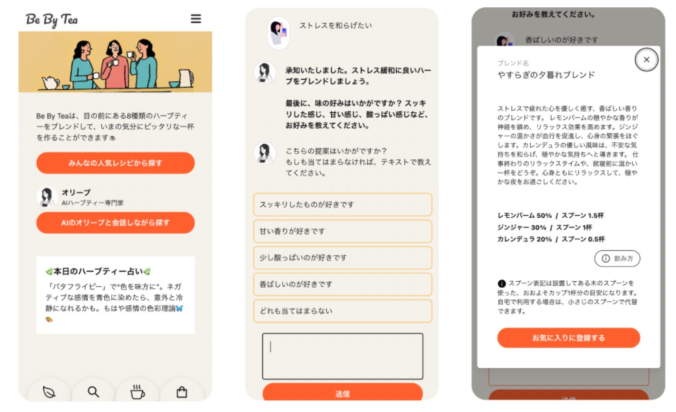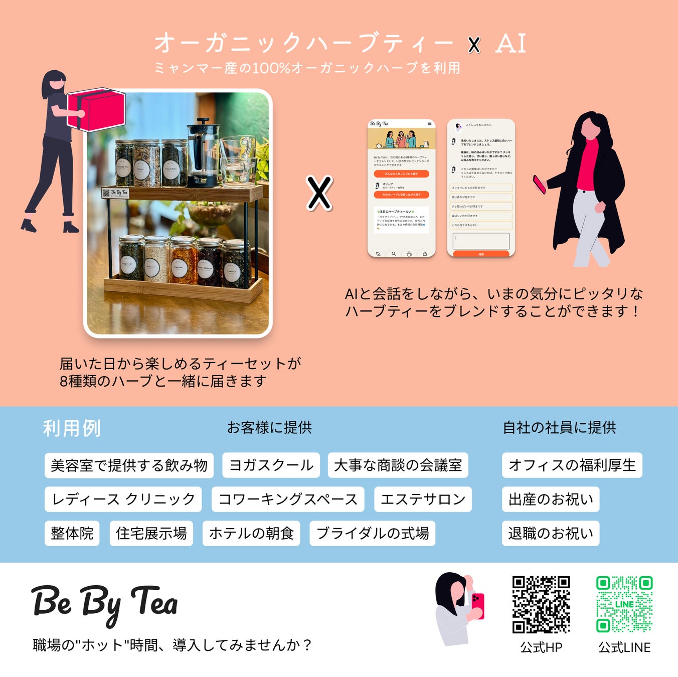 「Be By Tea」は、社員や顧客の気分・悩み・味の好みを入力するだけで、AIが世界に一つのブレンドを提案する体験型ハーブティーサービスです。