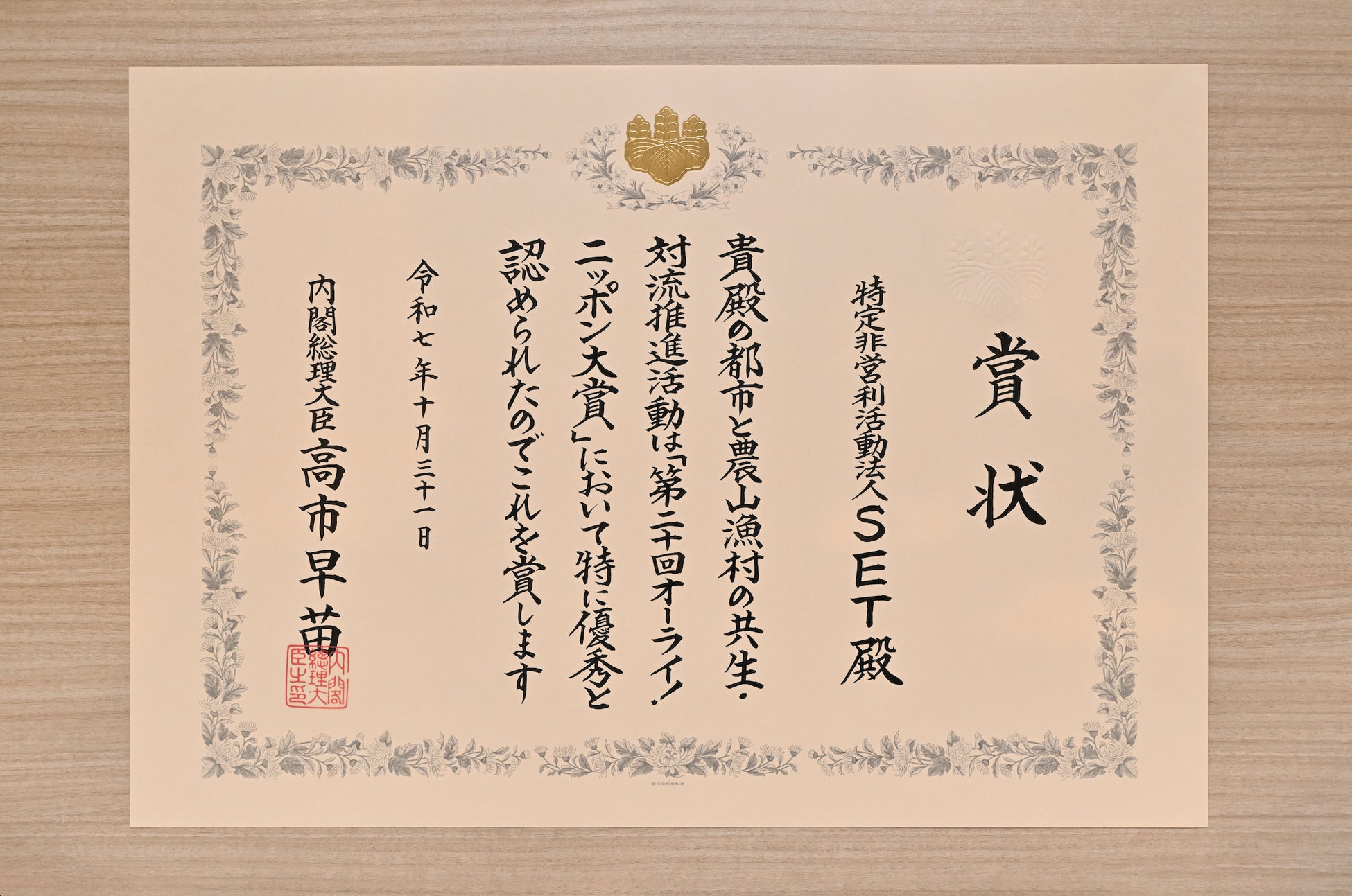 このたび、認定NPO法人SET(本部:岩手県陸前高田市、理事長:三井俊介)は、「第20回オーライ!ニッポン大賞」(主催:(一財)都市農山漁村交流活性化機構(まちむら交流きこう))において、内閣総理大臣賞を受賞いたしました。