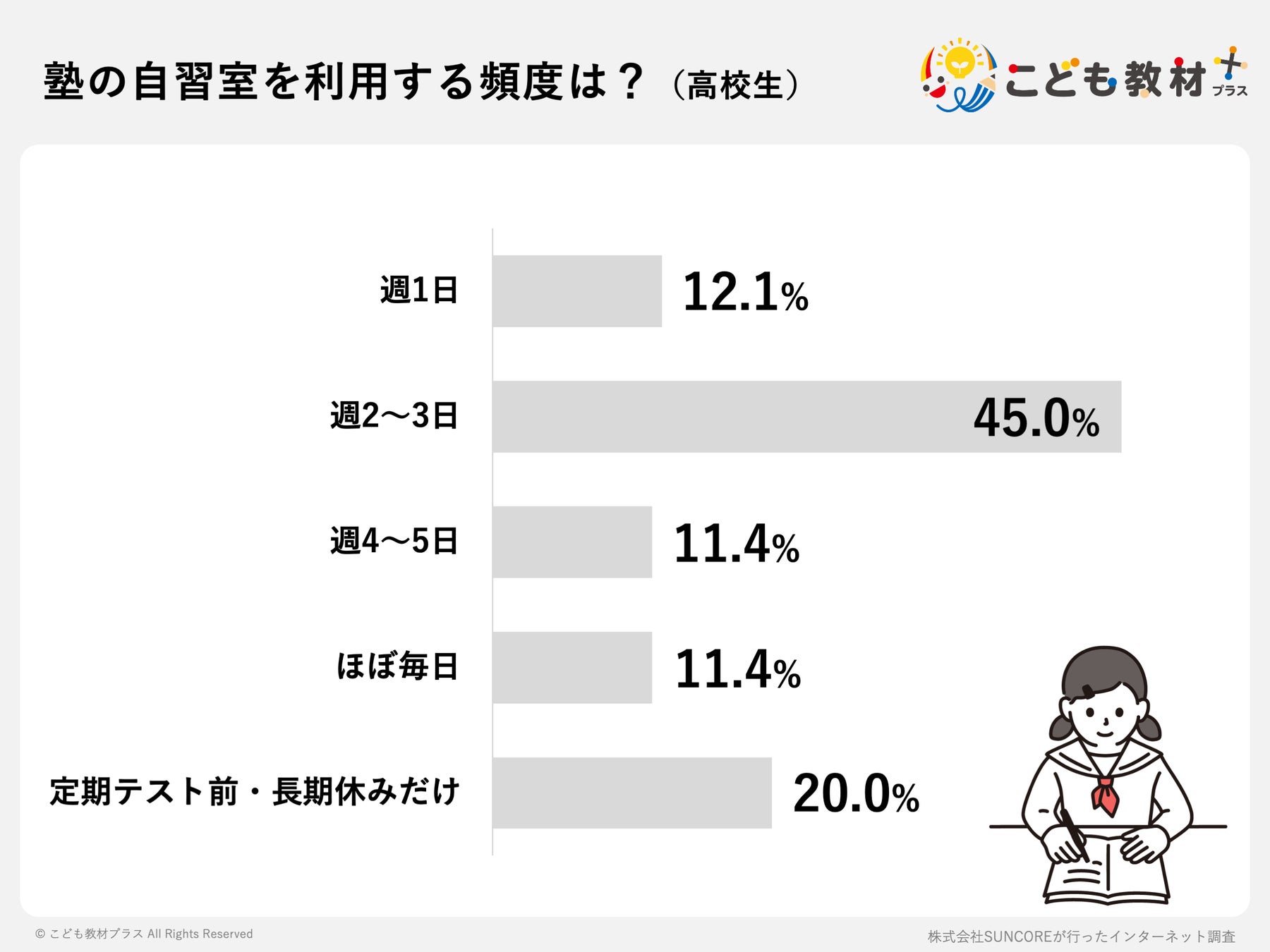目前に迫る大学受験。「どうすれば勉強に集中できるのか?」という課題に対し、その鍵が「場所」選びにあることが明らかになりました。日本最大級の教育Webメディア「こども教材プラス」(運営:株式会社SUNCORE)が、塾の自習室を利用した経験のある高校生の保護者140名を対象にアンケート調査を実施しました。
