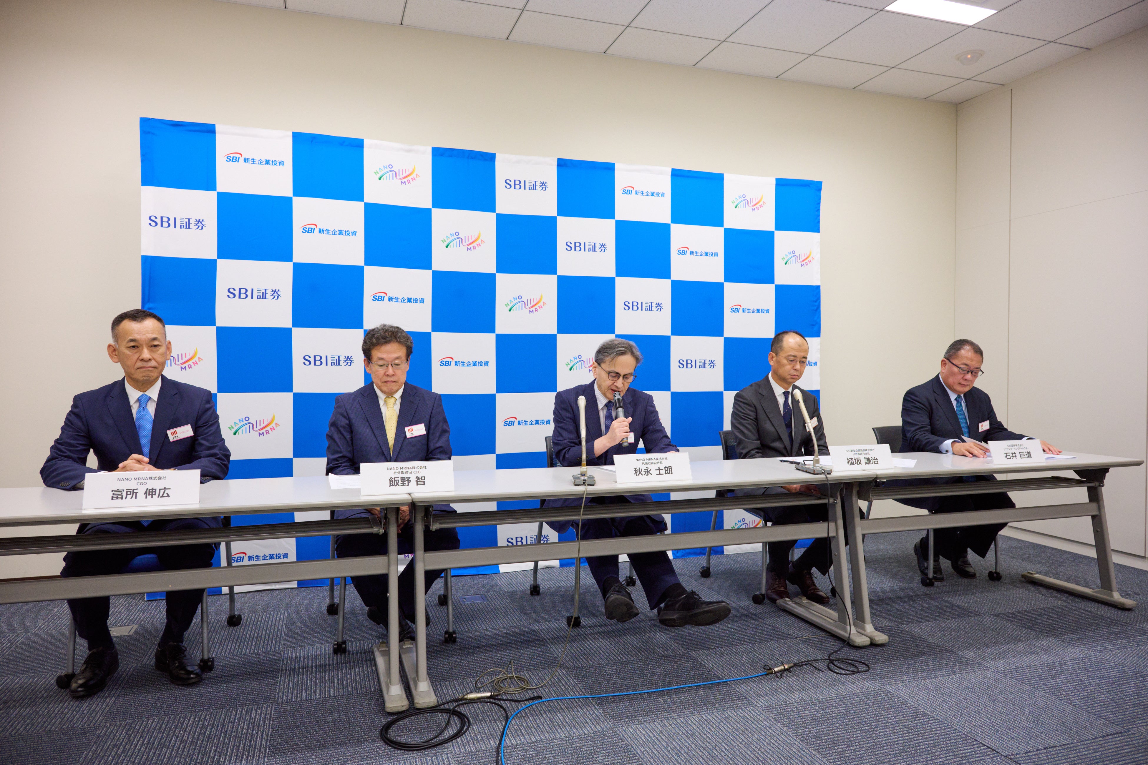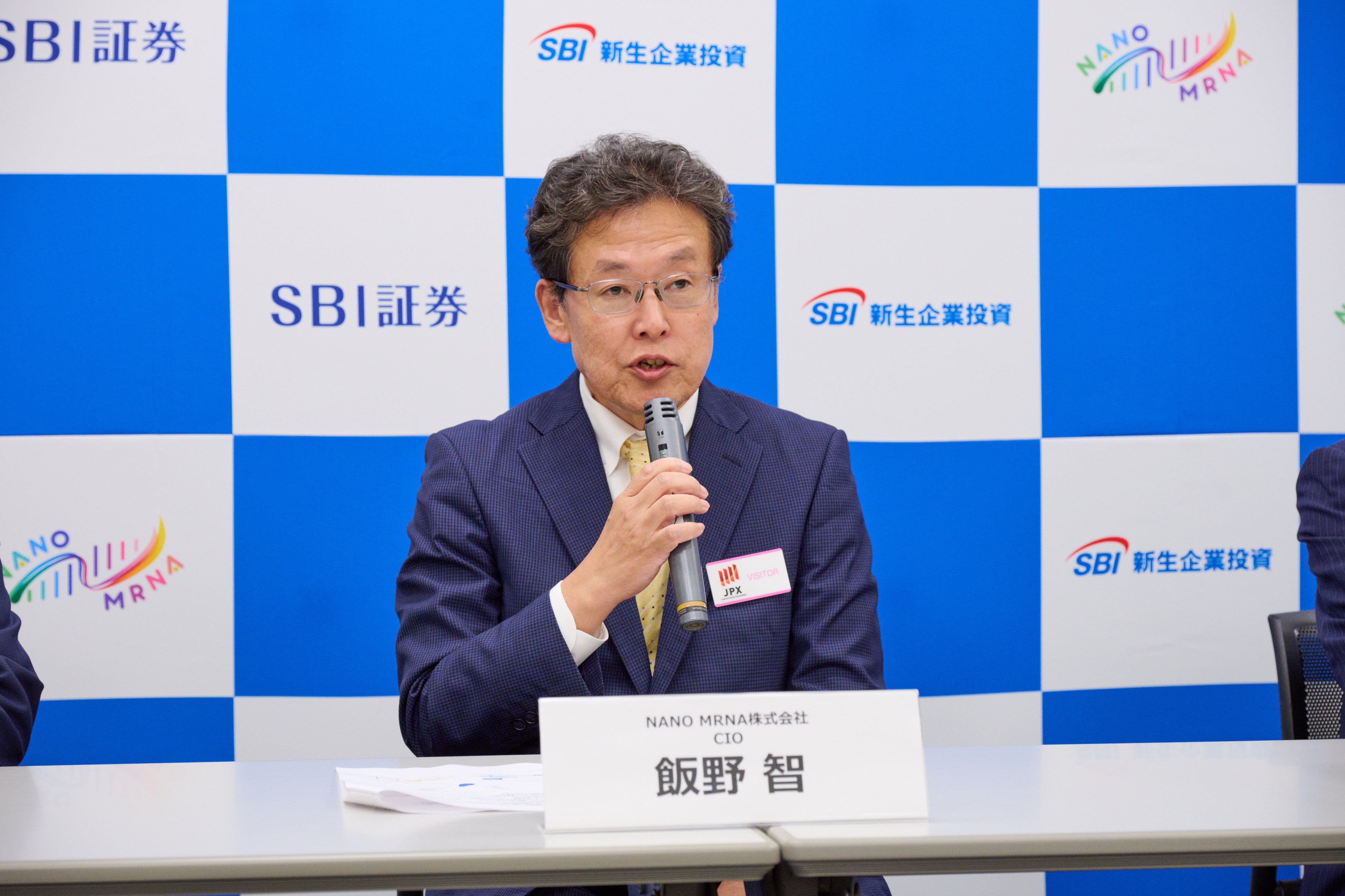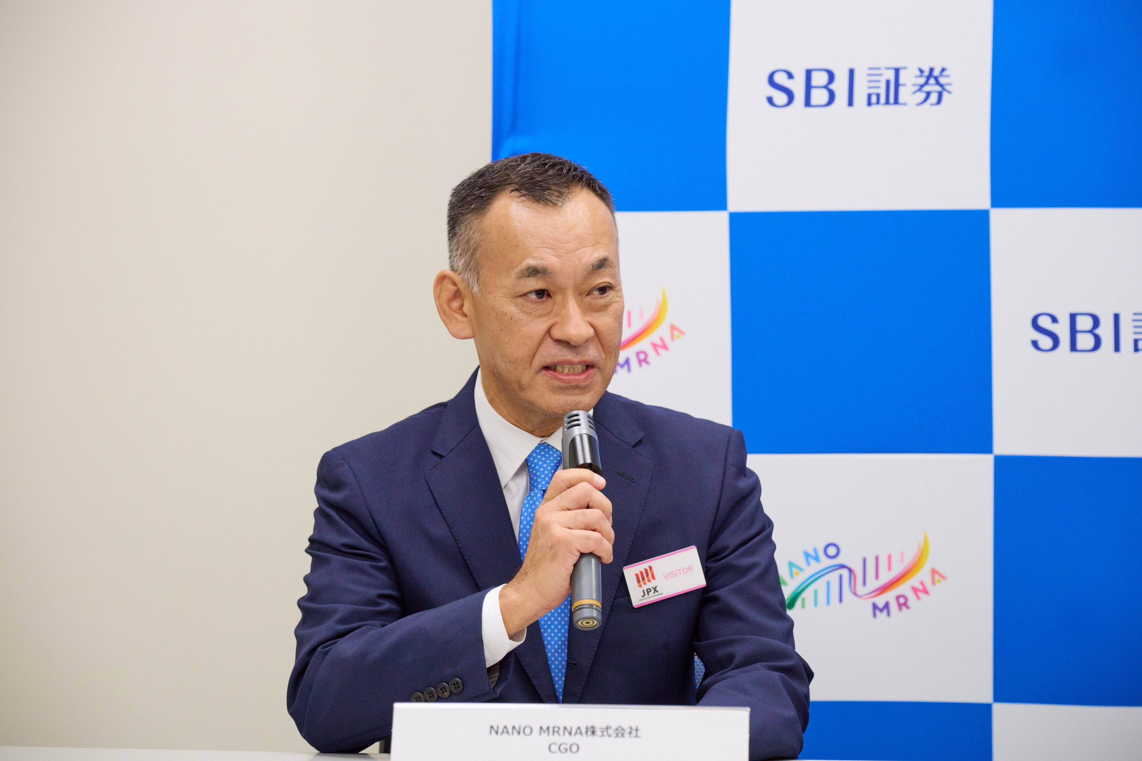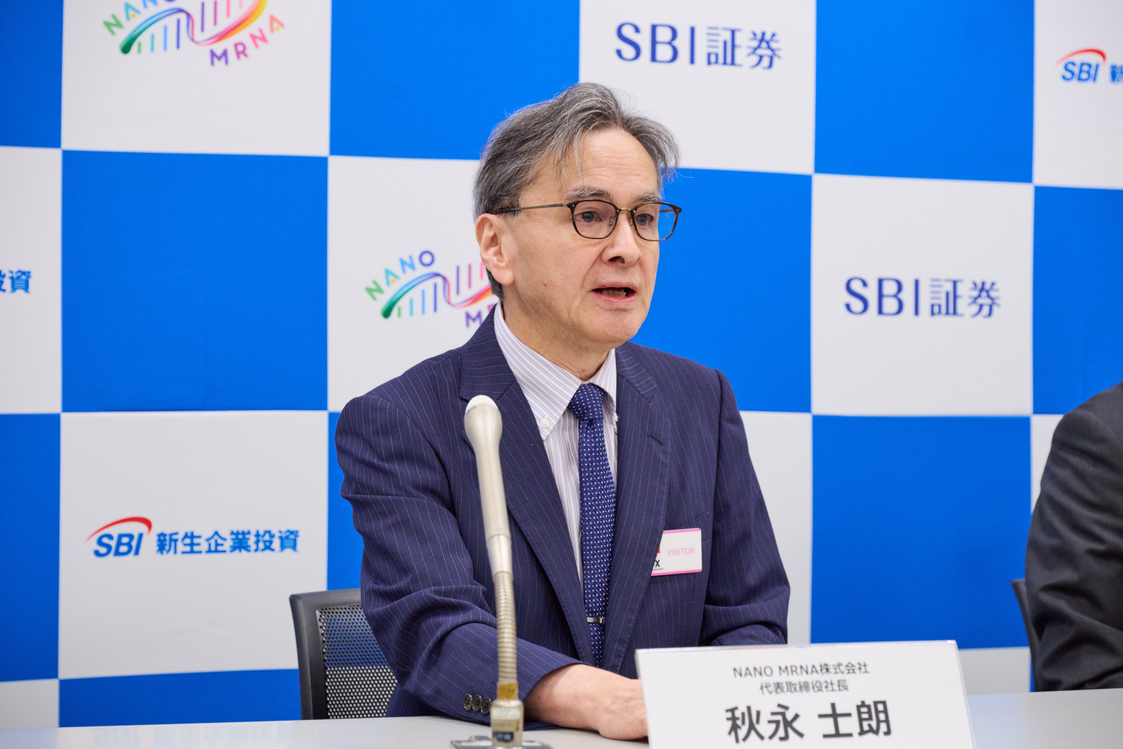 2025年10月8日午後、東京証券取引所内にある兜クラブ記者会見室にて、NANO MRNA株式会社(本社:東京都港区、代表取締役社長・秋永士朗氏)は、株式会社SBI証券、SBI新生企業投資株式会社との提携を発表するための記者会見を開きました。