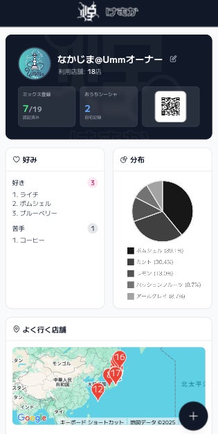 登録したミックス数、訪問店舗数、評価の統計をひと目で確認。よく使うフレーバーランキング表示も。