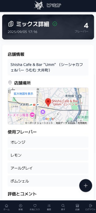 フレーバーの組み合わせを写真・評価(5段階)・コメント付きで記録。店舗でのミックスはもちろん、自宅で楽しむ「おうちシーシャ」も記録可能。 メーカー・フレーバー名を選択するだけの簡単入力。