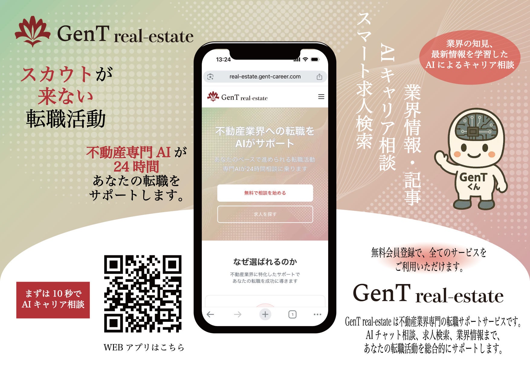 AI技術を活用し、不動産業界に特化した転職活動を全面的にサポートする新しいWEBアプリケーション「GenT real-estate」を2025年9月22日より提供開始したことをお知らせいたします。本サービスは、転職希望者が時間や場所、他人の目を気にすることなく、自身のキャリアについてじっくり考え、最適な一歩を踏み出すための新しい選択肢を提案します。