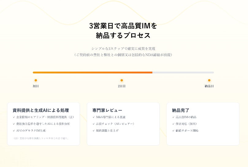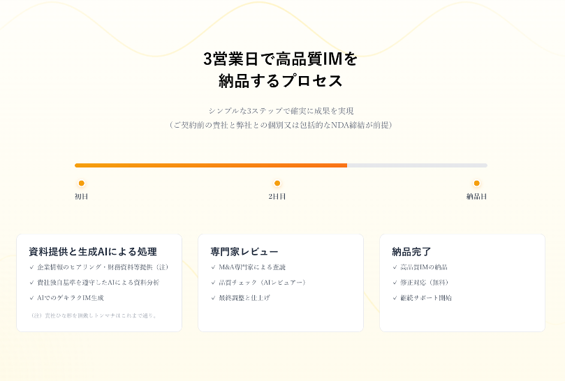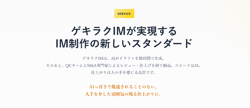 AIがドラフトを数時間で生成し、その後QCチームとM&A専門家によるレビュー・仕上げを経て納品するIM制作代行サービスです。スピードはAI、仕上がりは人の手を感じる品質です。AIっぽさで敬遠されることのない、人手を介した雰囲気の残る仕上がりにこだわっています。