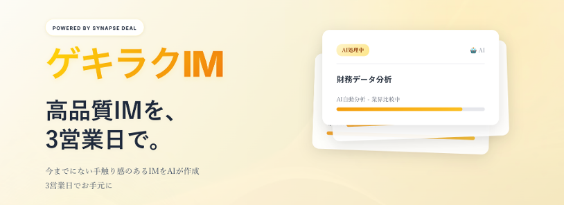 SYNAPSE DEAL株式会社(本社:東京都江東区、代表取締役:中田隆三)は、M&A仲介業界向けIM(インフォメーション・メモランダム)制作代行サービス「ゲキラクIM」を2026年3月2日より提供開始します。