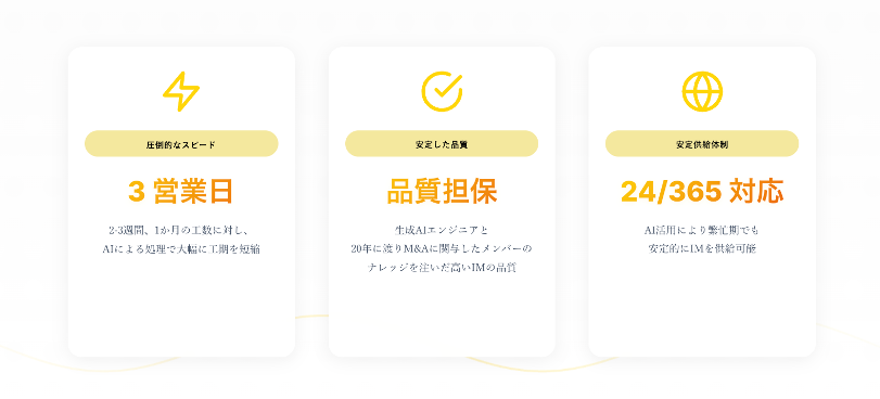 生成AIとM&A専門家によるレビューを組み合わせ、従来2〜3週間、最長1か月ほどかかっていたIM作成を最短3営業日で納品します。