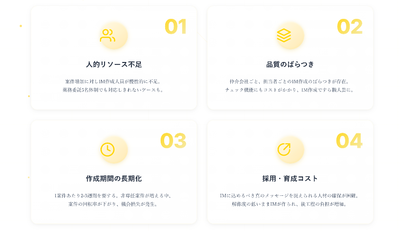 仲介会社ごと、担当者ごとのIM作成のばらつきが存在します。チェック機能にもコストがかかり、IM作成ですら事実上「職人芸」と化しているのが実態です。